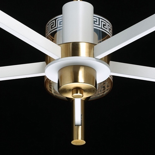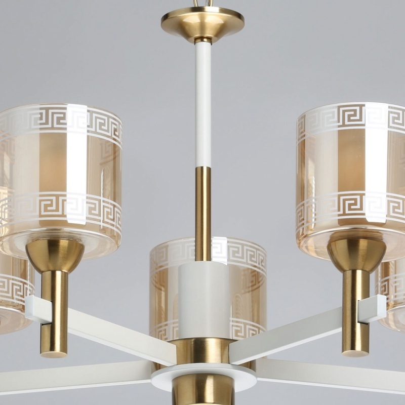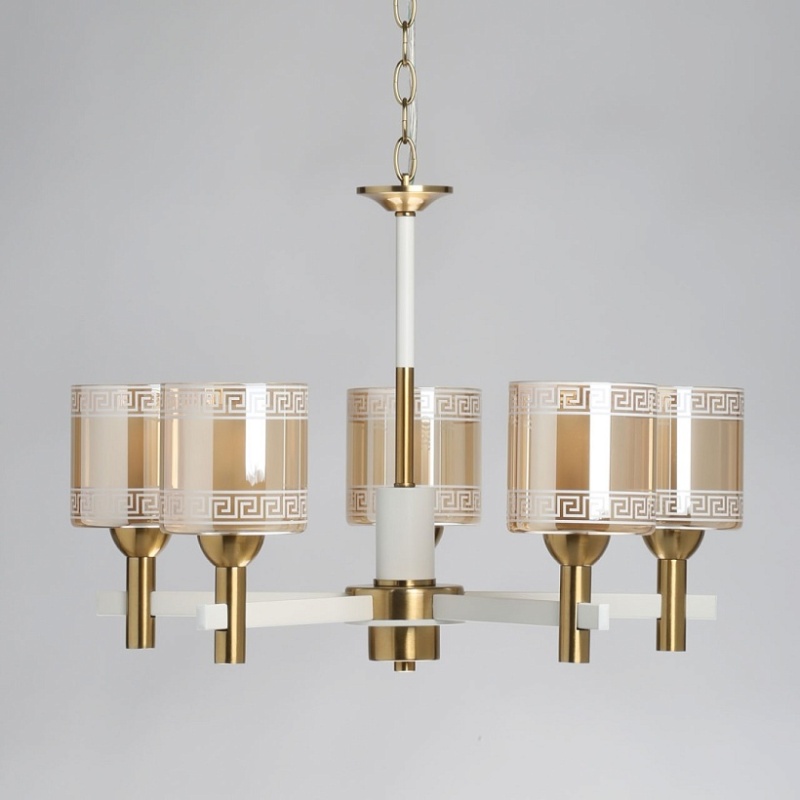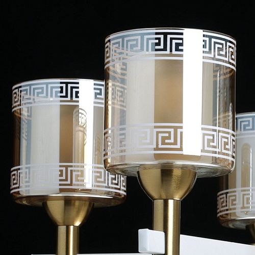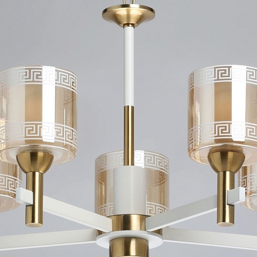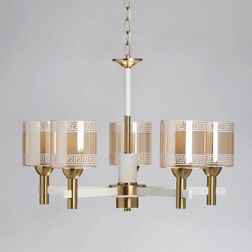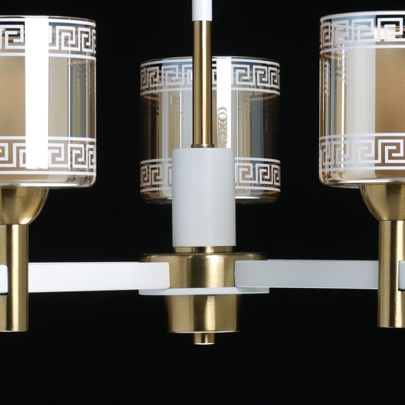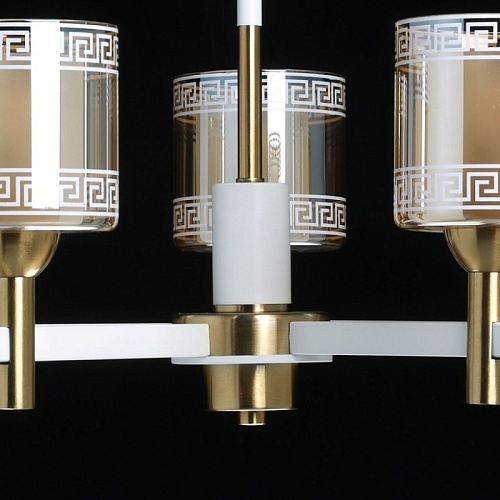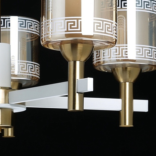 Металлическое основание подвесной люстры окрашено в белый цвет. Отдельные элементы основания гальванизированы в цвет золота. Источники света закрыты двойными стеклянными плафонами, где внутренний плафон матирован, а внешний плафон гальванизирован в цвет шампань. На внешние плафоны белой краской по трафарету нанесен орнамент в греческом стиле.
