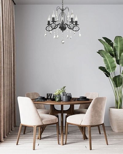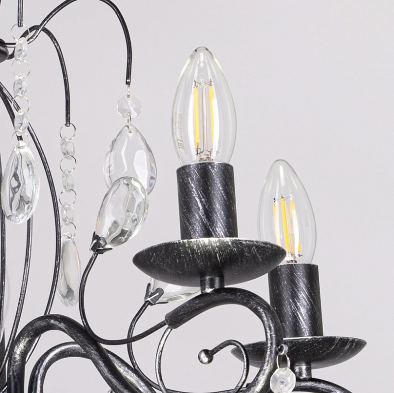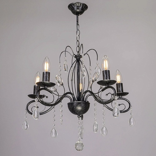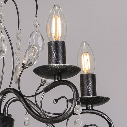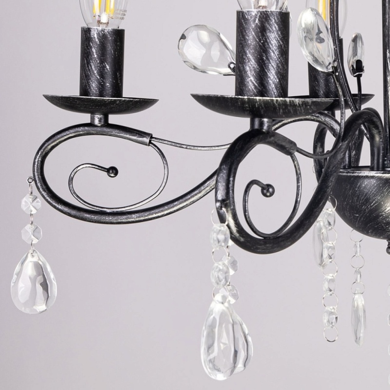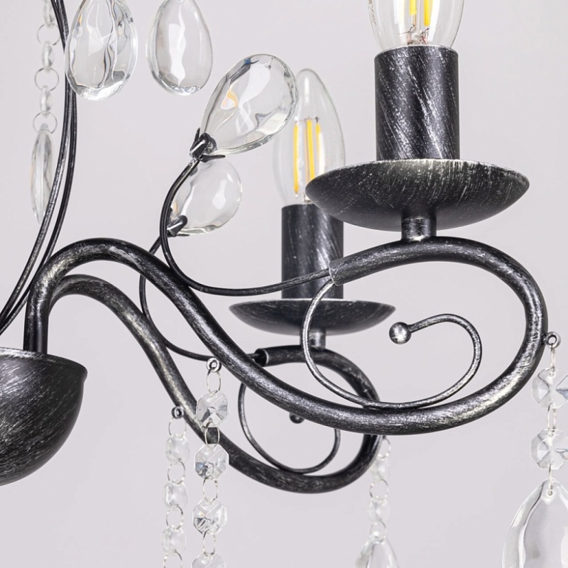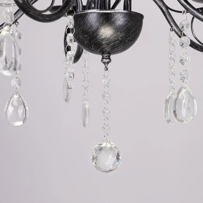 Металлическое основание светильника окрашено в черный цвет и обработано по технологии хай-лайт в серебряный цвет. Светильник декорирован стеклянными подвесами миндалевидной формы и хрусталем в форме шара.