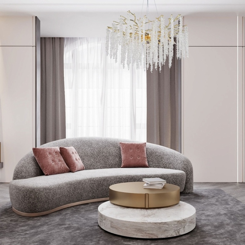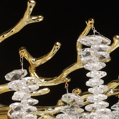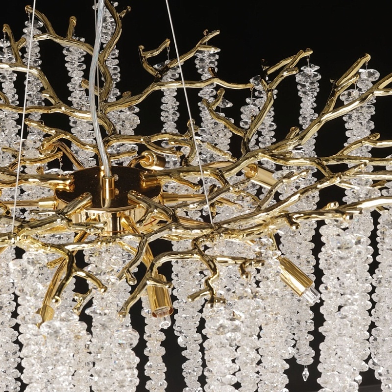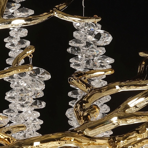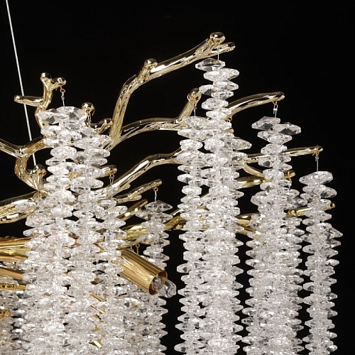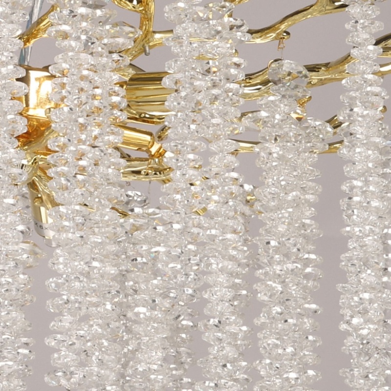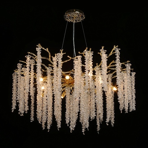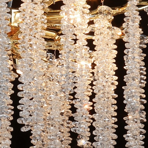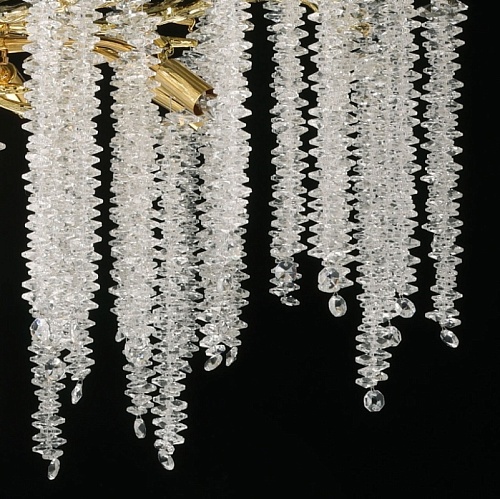 Основание подвесной люстры выполнено по технологии художественного литья из сплава алюминия с цинком и гальванизировано в цвет золота. Люстра декорирована бусами из прозрачного хрусталя.