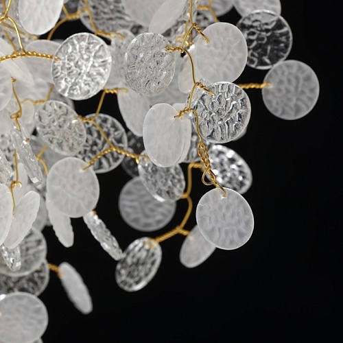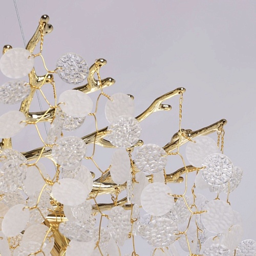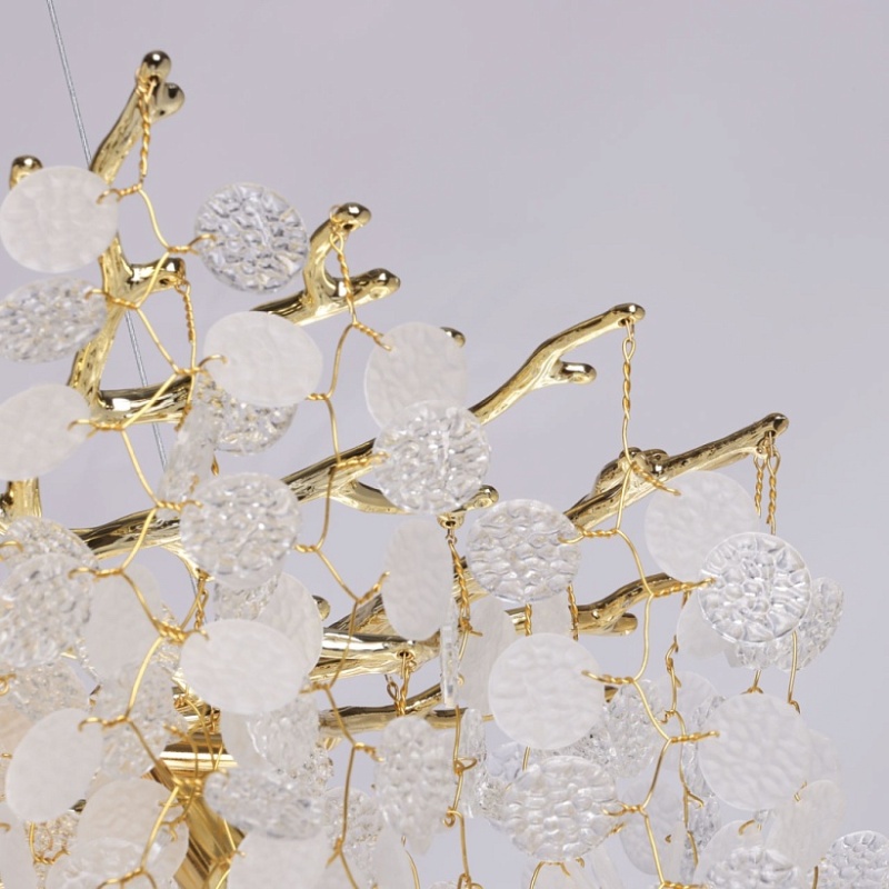 Основание подвесной люстры выполнено по технологии художественного литья из сплава алюминия с цинком и гальванизировано в цвет золота. Люстра декорирована прозрачным фактурным стеклом круглой формы.