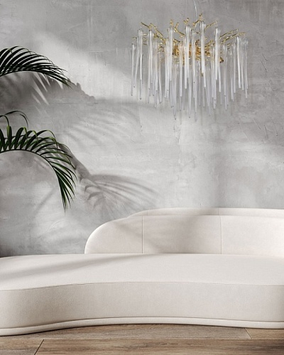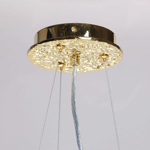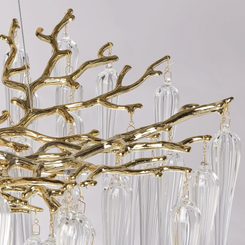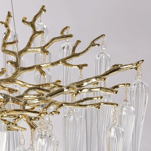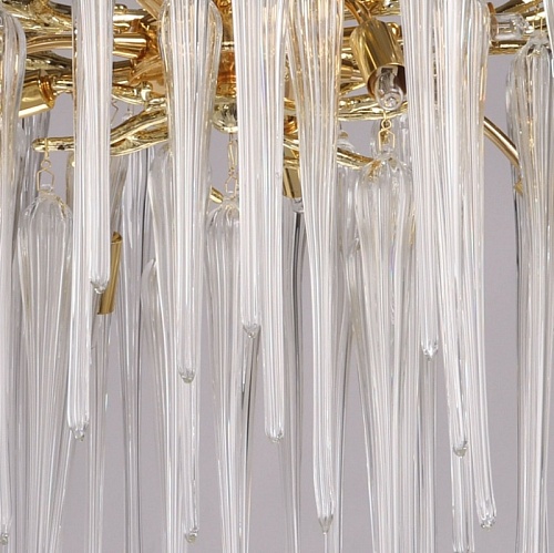 Основание подвесной люстры выполнено по технологии художественного литья из сплава алюминия с цинком и гальванизировано в цвет золота. Люстра декорирована прозрачным стеклом вытянутой формы.