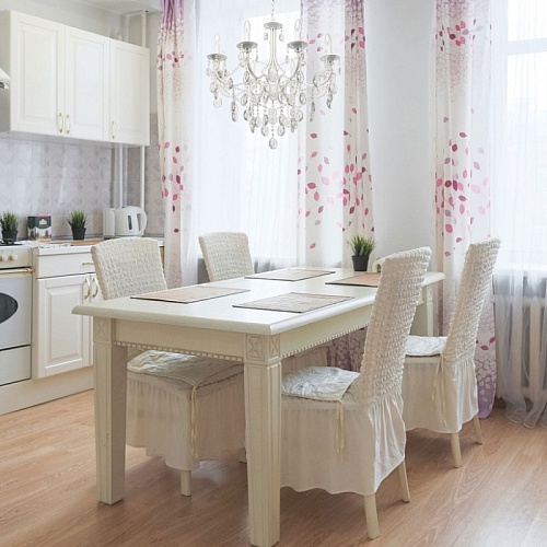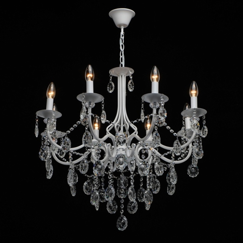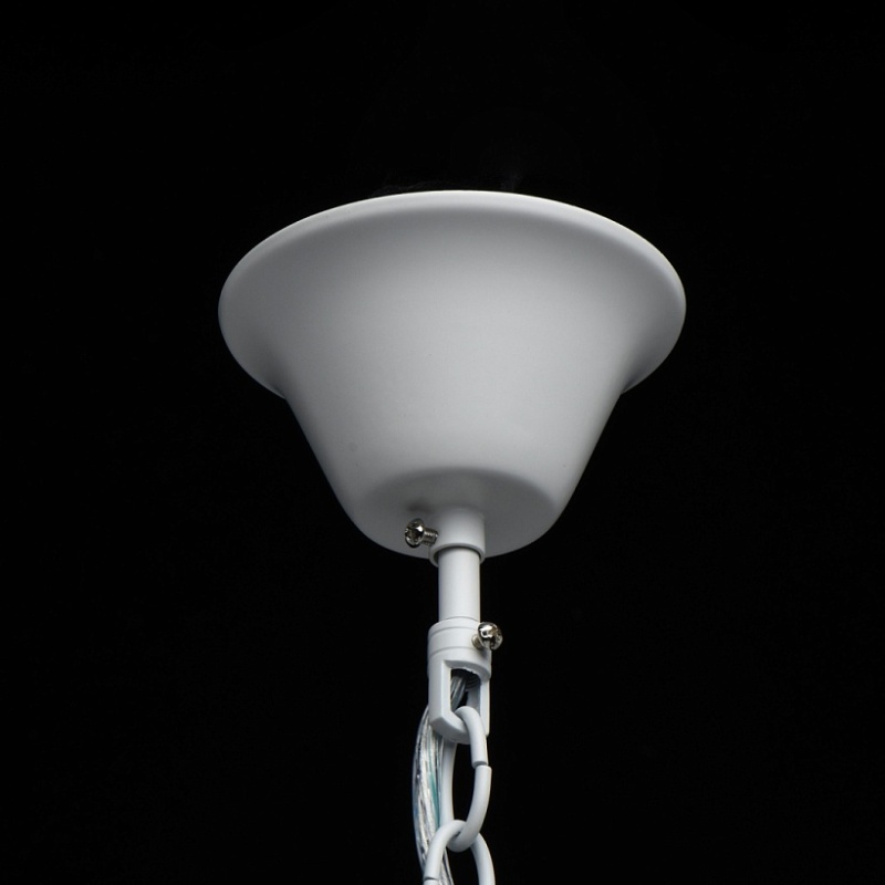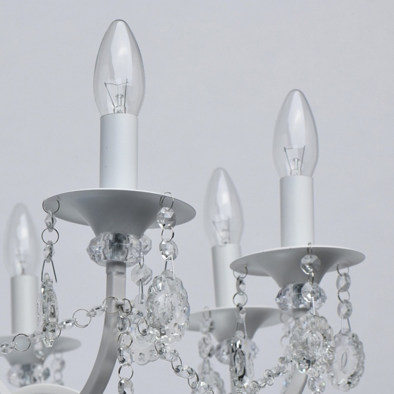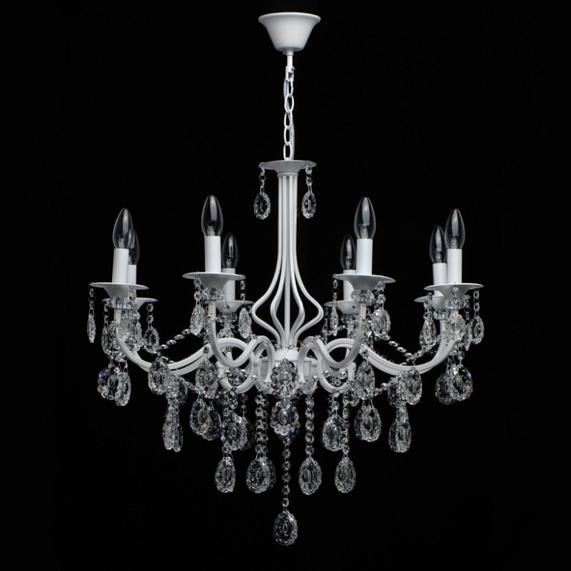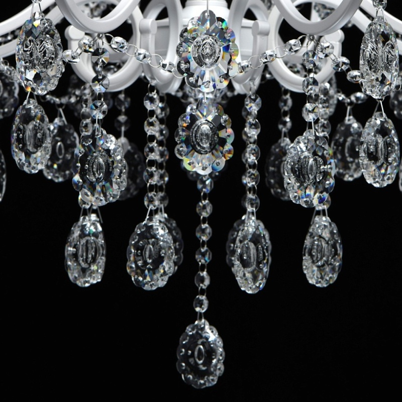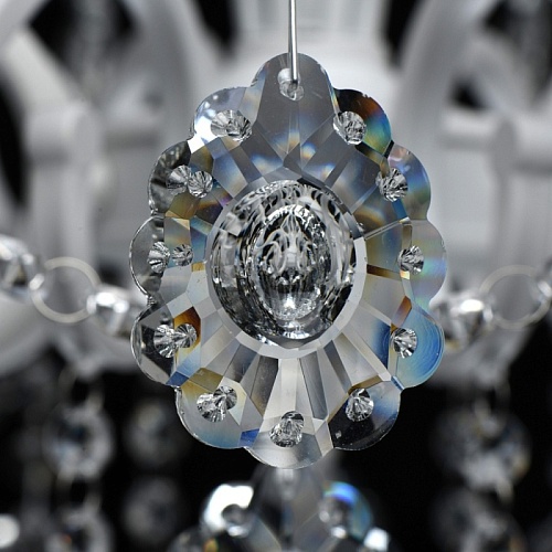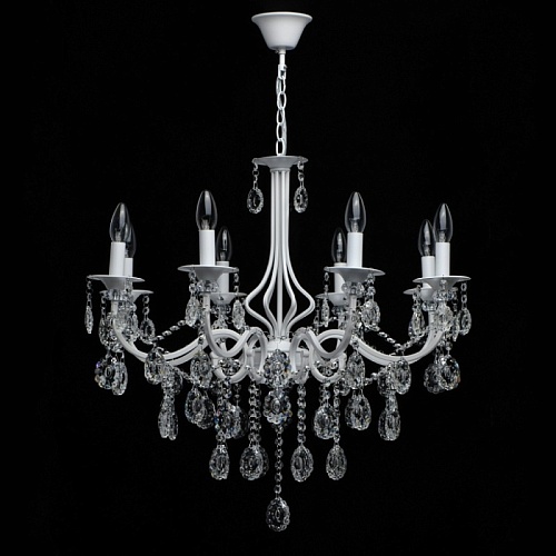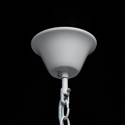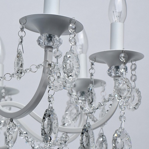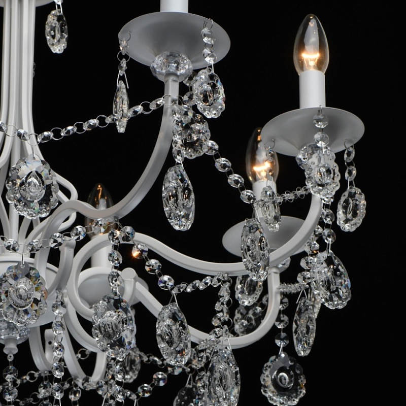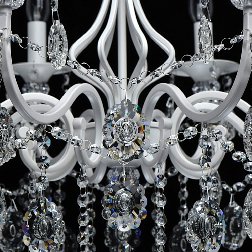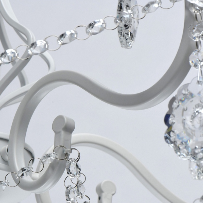 Основание светильника выполнено из металла и окрашено в белый цвет. Светильник декорирован прозрачным хрусталем оригинальной формы.