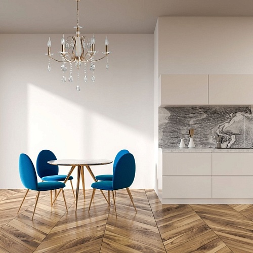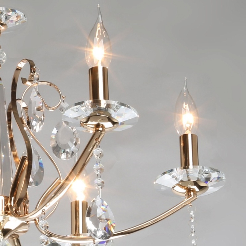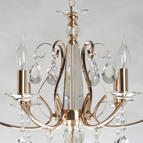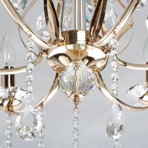 Металлическое основание подвесного светильника гальванизировано в цвет золота. Светильник декорирован прозрачным хрусталем.