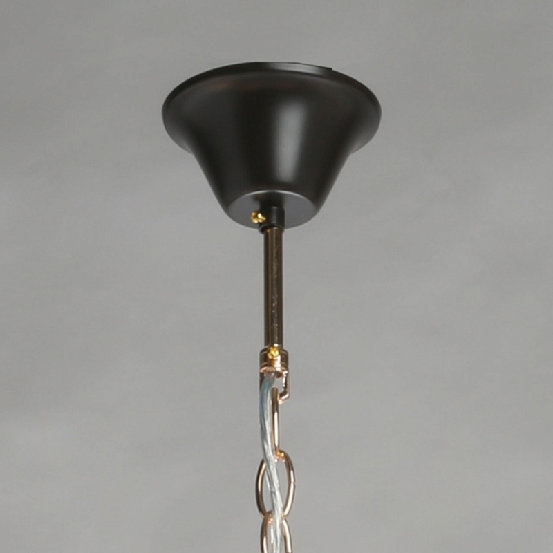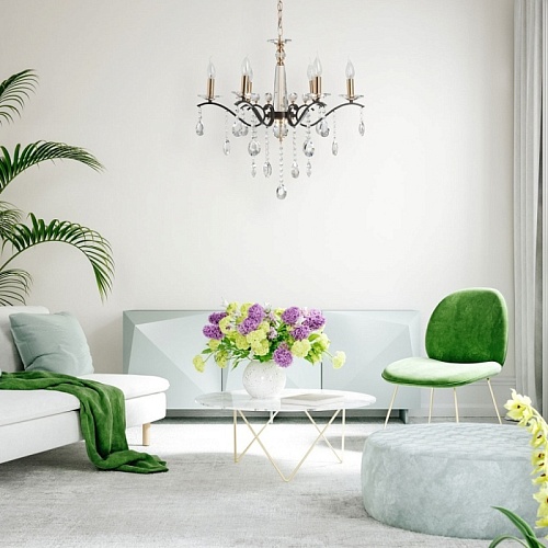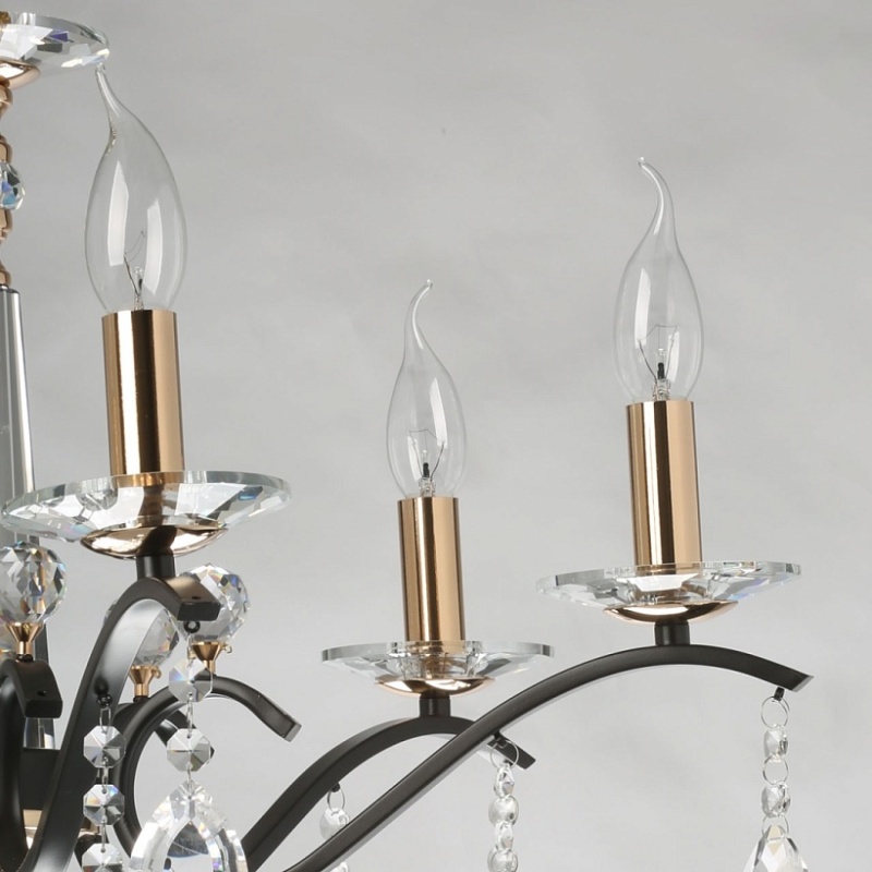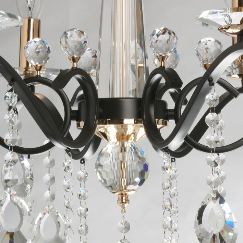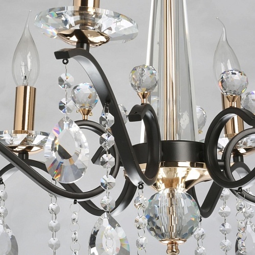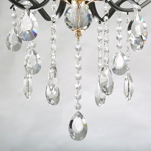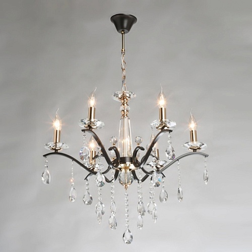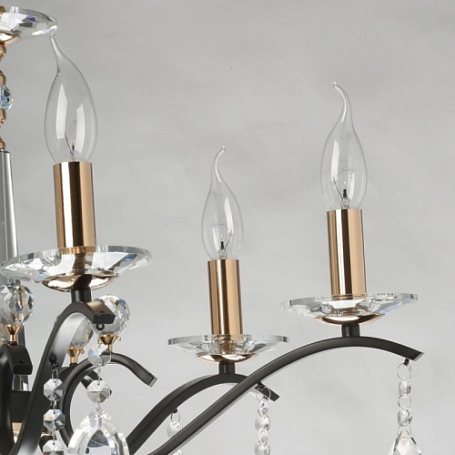 Металлическое основание потолочного светильника окрашено в цвет кофе. Отдельные элементы гальванизированы в цвет золота. Светильник декорирован прозрачным хрусталем.