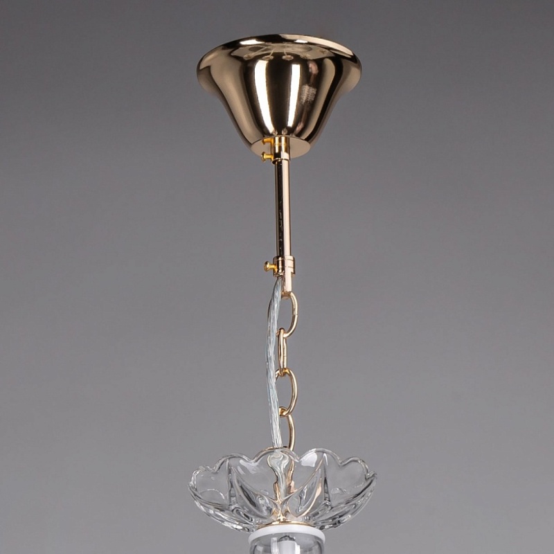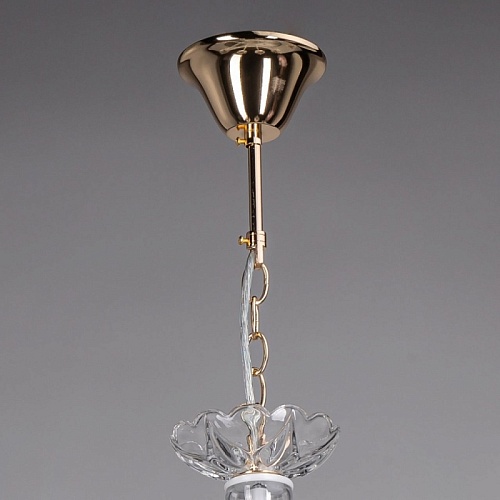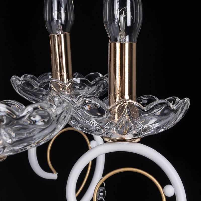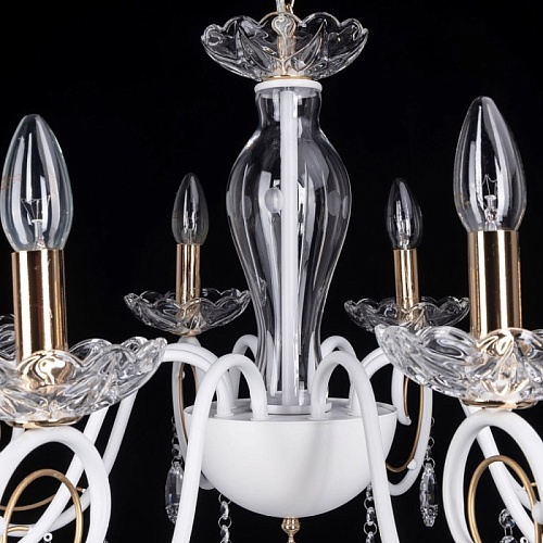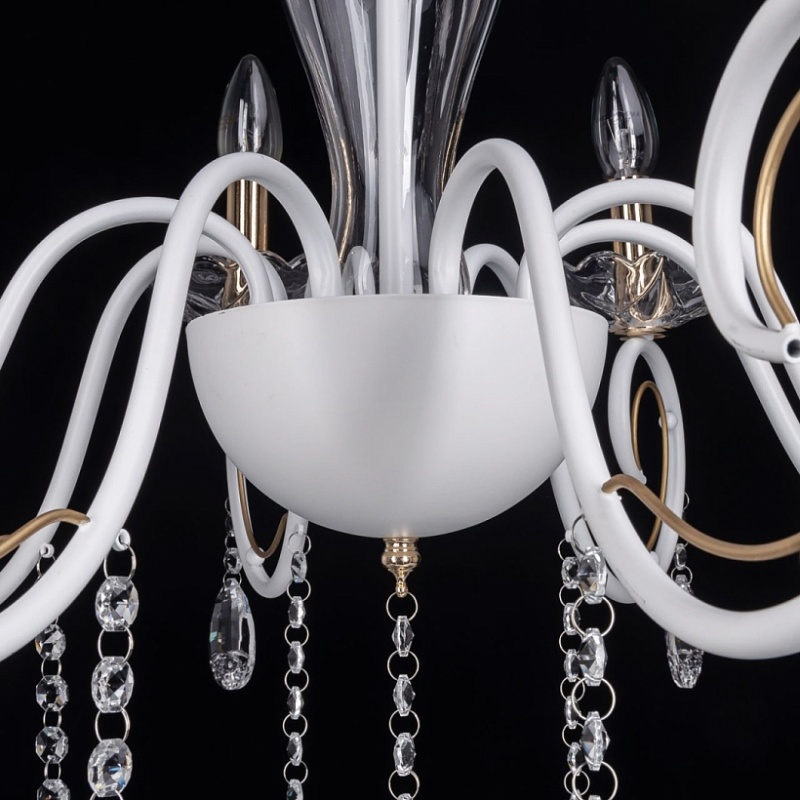 Металлическое основание подвесной люстры окрашено в белый цвет. Отдельные элементы основания гальванизированы в цвет золота. Декоративные розетки и декор центральной оси выполнены из прозрачного стекла. Люстра декорирована подвесками из прозрачного хрусталя.