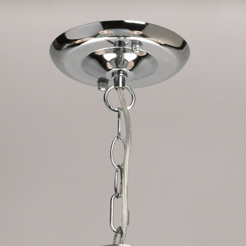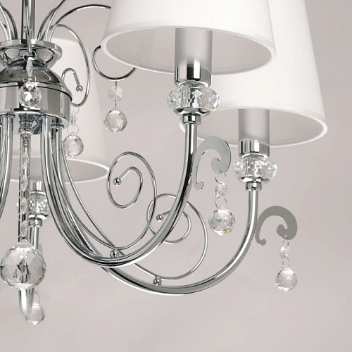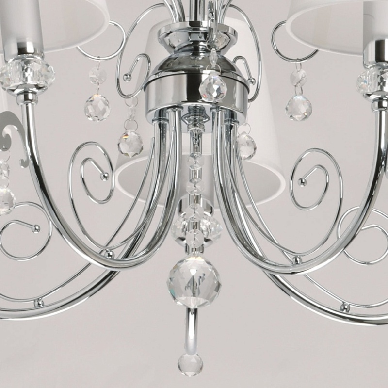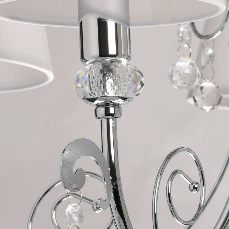 Металлическое основание подвесной люстры гальванизировано в цвет хрома. Источники света закрыты двухслойными текстильными абажурами белого цвета с термостойким акрилом внутри. Абажуры прошиты. Светильник декорирован прозрачным хрусталем.
