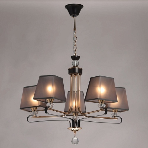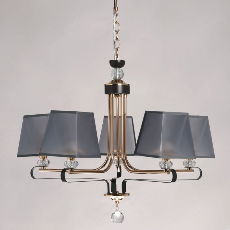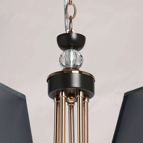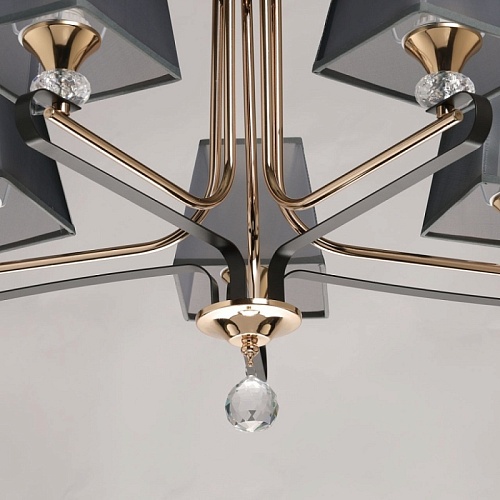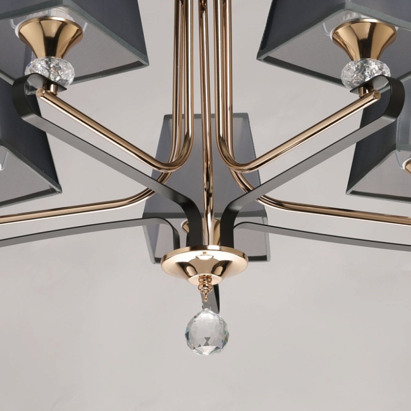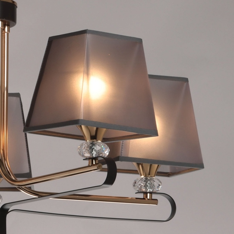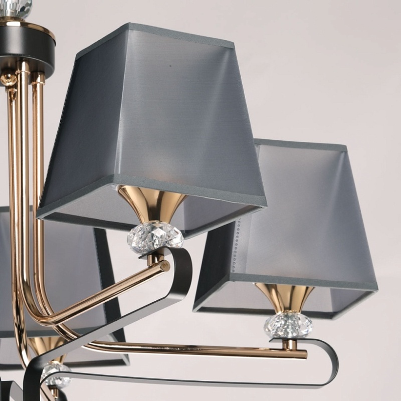 Металлическое основание подвесной люстры окрашено в цвет кофе. Отдельные элементы основания гальванизированы в цвет золота. Традиционные источники света закрыты текстильными абажурами серого цвета с прозрачным термостойким акрилом внутри. Абажуры прошиты и отделаны кантом сверху и снизу. Люстра декорирована прозрачным хрусталем.