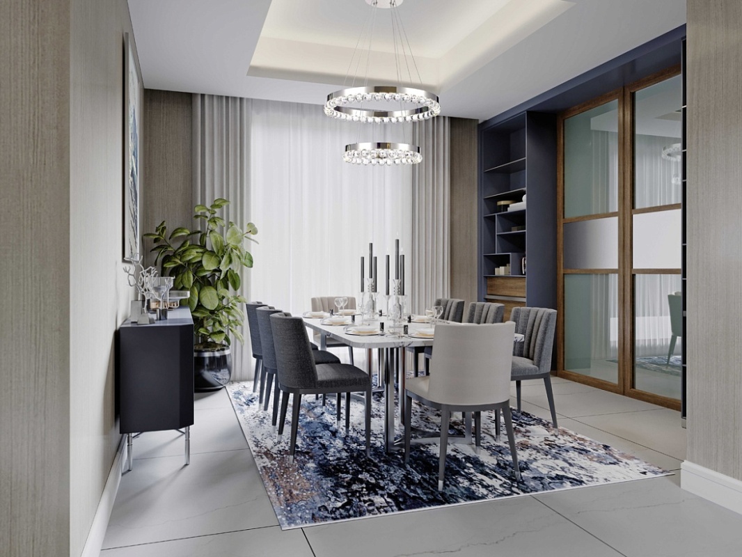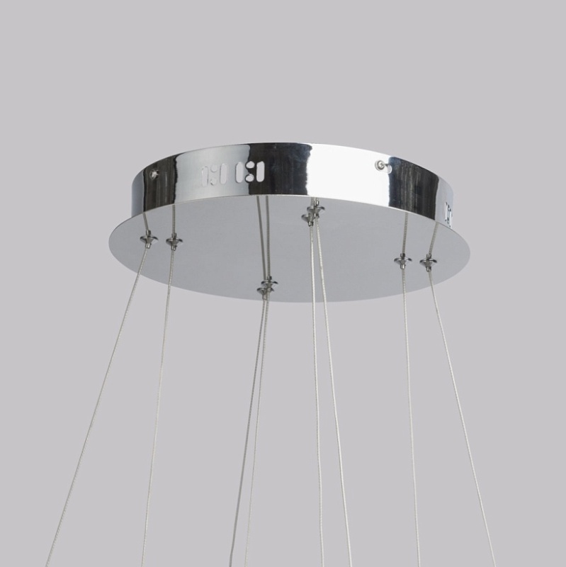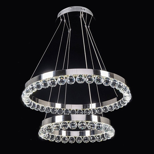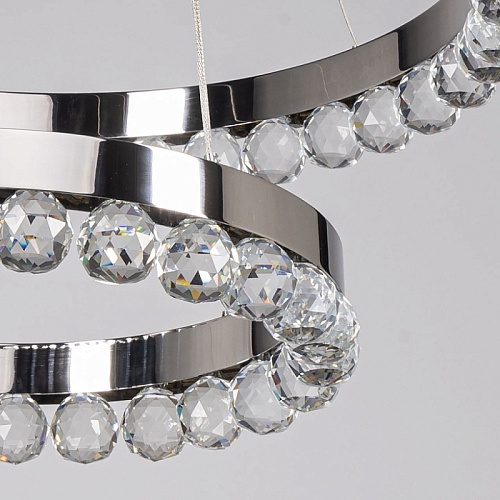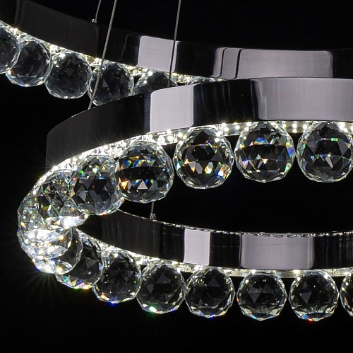 Металлическая потолочная чаша гальванизирована в цвет хрома. Корпус плафонов выполнен из нержавеющей стали, отполированной до зеркального блеска. Подвесная люстра декорирована прозрачным хрусталем в форме шаров.