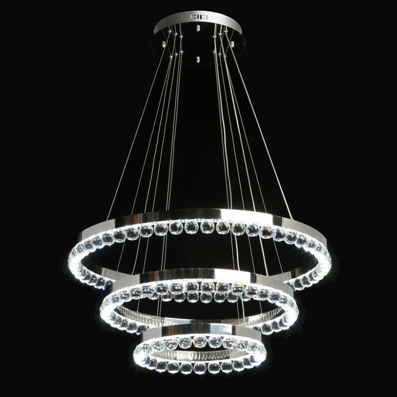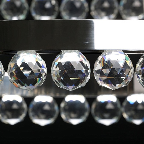 Металлическая потолочная чаша гальванизирована в цвет хрома. Корпус плафонов выполнен из нержавеющей стали, отполированной до зеркального блеска. Подвесная люстра декорирована прозрачным хрусталем в форме шаров.