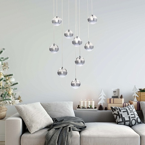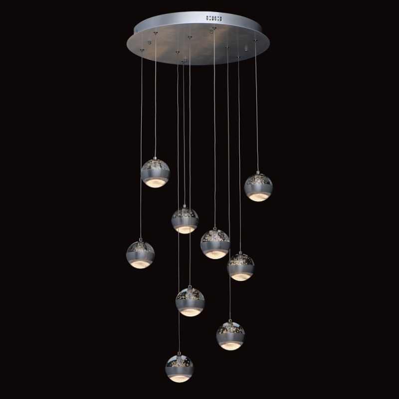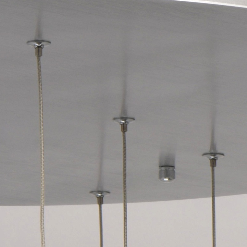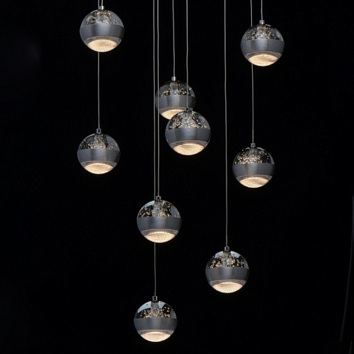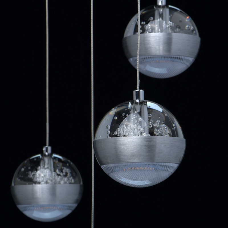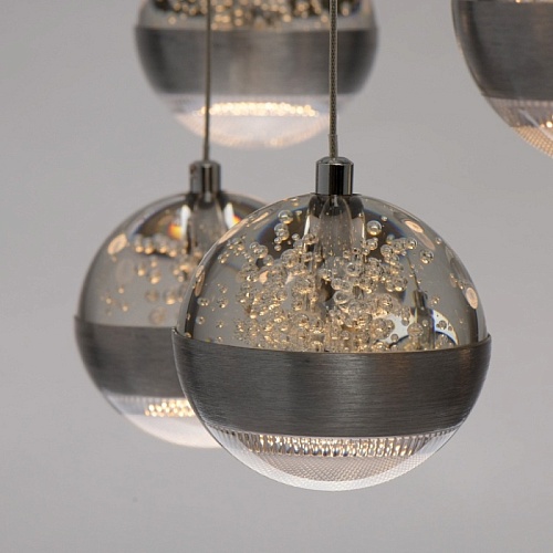 Основание светильника выполнено из комбинации сплавов металлов. Потолочная чаша выполнена из металла и окрашена в цвет серебра. Потолочная чаша закрыта пластиной из сплава алюминия цвета античного серебра, обработанного по технологии браширования с последующим патинированием.Плафоны на подвесах в виде тросов: каркасы плафонов выполнены из сплава алюминия цвета античного серебра и обработаны по технологии браширования с последующим патинированием. В верхней части плафонов светодиодный источник света типа SMD chip закрыт стеклом, отлитым в форму и обработанным по технологии пулегозо, при которой в плафоне образуются пузырьки. В нижней части плафона второй светодиодный источник света типа SMD chip закрыт прозрачным акрилом с фактурой сот.