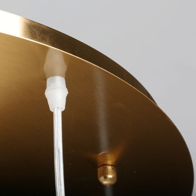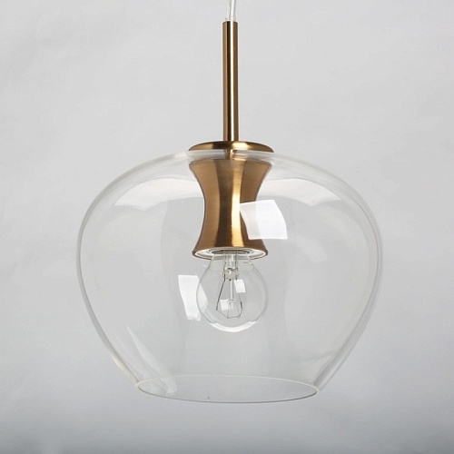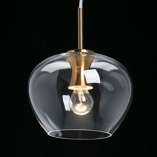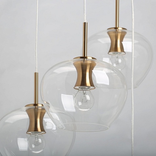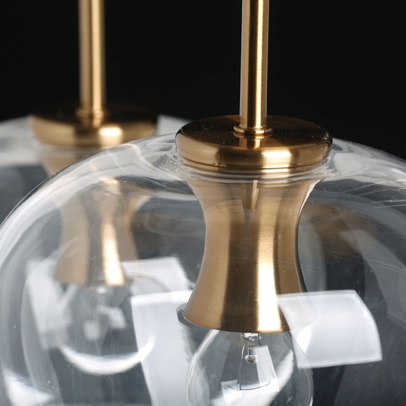 Основание светильника выполнено из металла и гальванизировано в цвет меди. Светильник декорирован круглыми плафонами из прозрачного стекла.