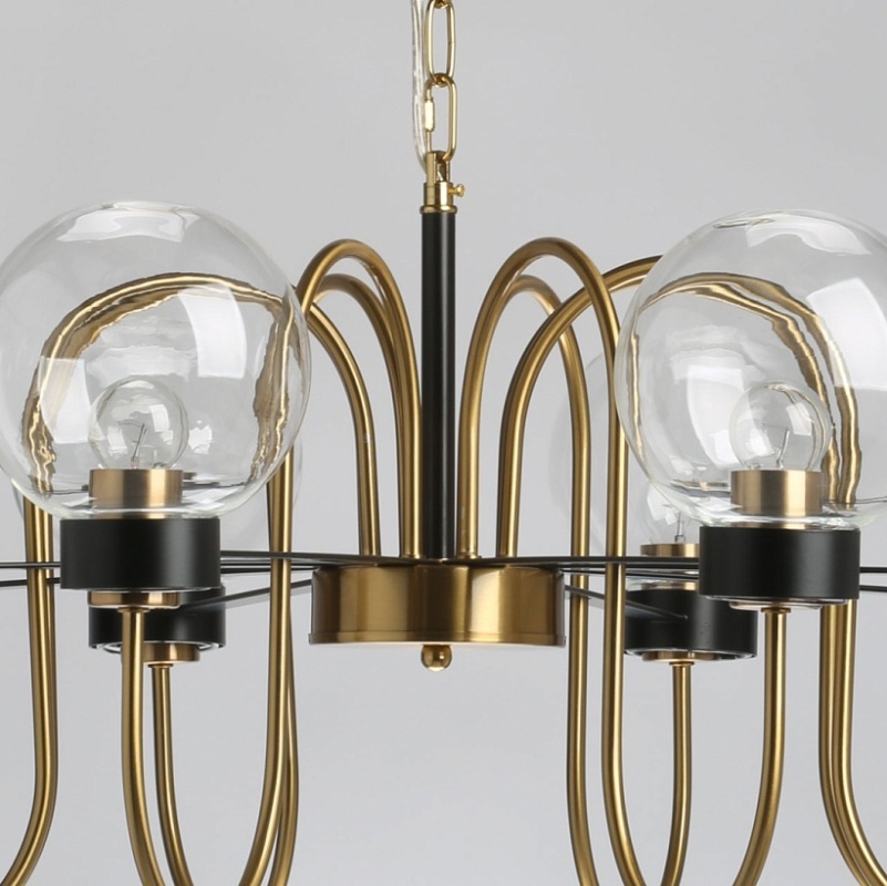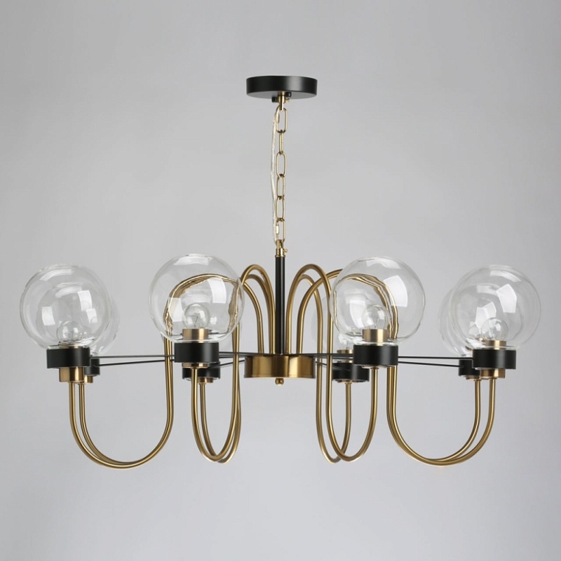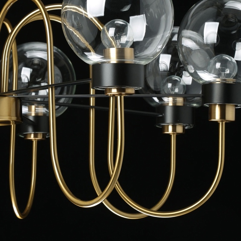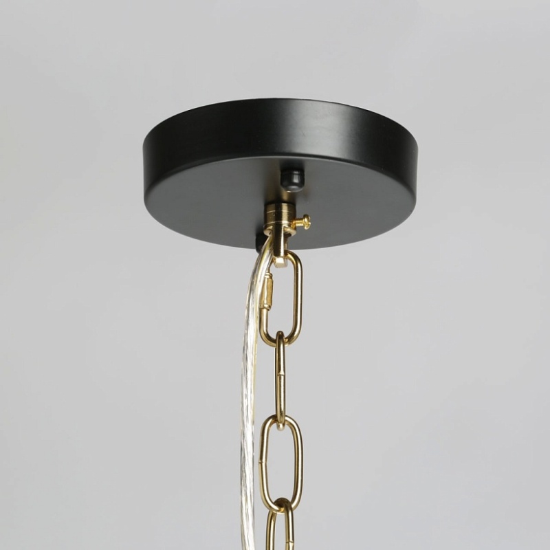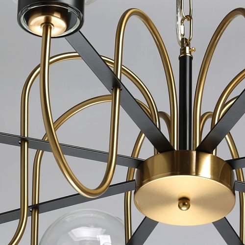 Металлическое основание подвесной люстры гальванизировано в цвет латуни. Отдельные элементы основания окрашены в черный цвет. Светильник декорирован прозрачными стеклянными плафонами ручной выдувки.