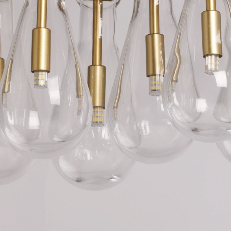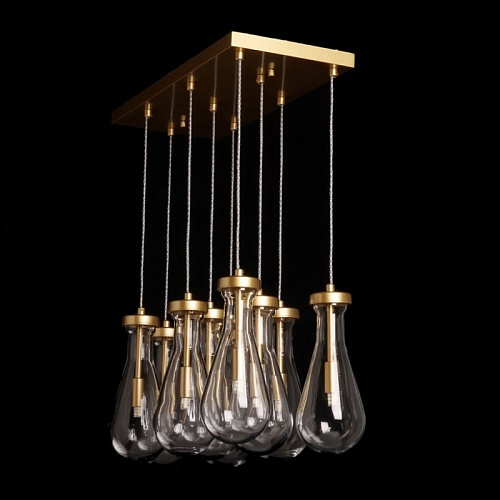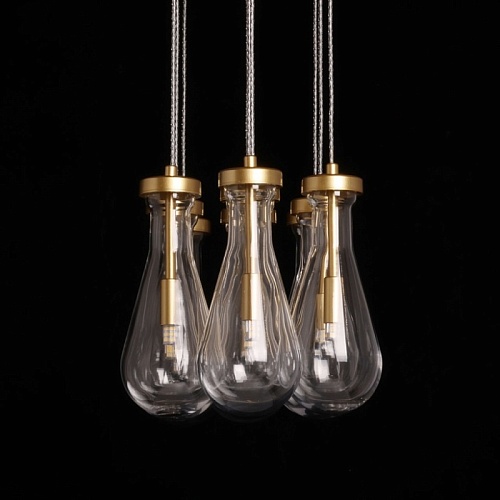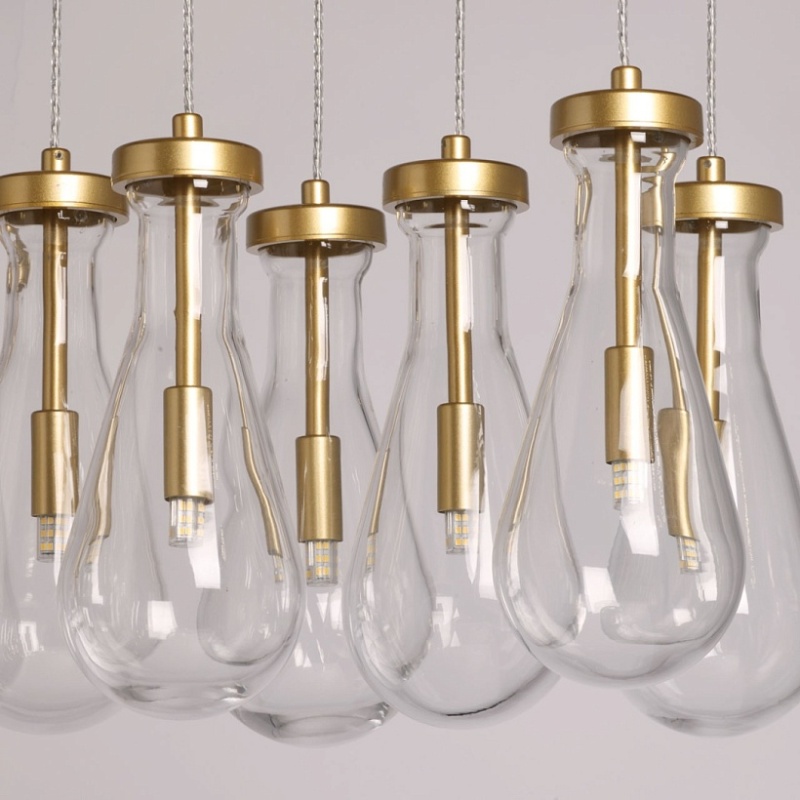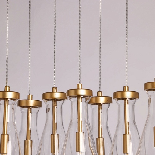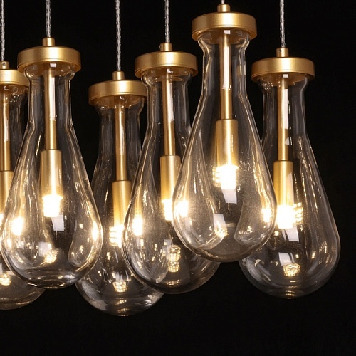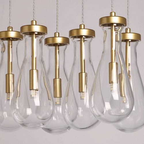 Металлическое основание подвесной люстры окрашено в цвет матового золота. Светильник декорирован оригинальными плафонами обтекаемой формы, выполненными из прозрачного, выдувного вручную стекла