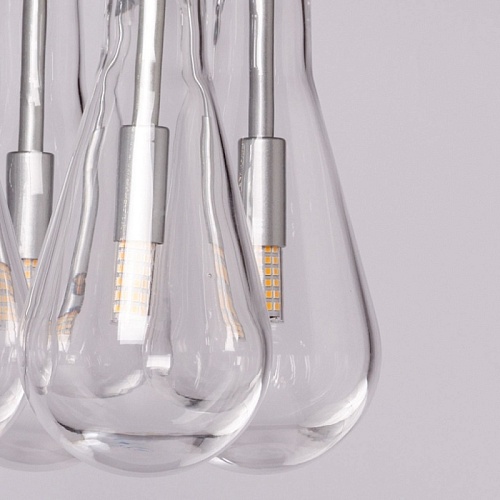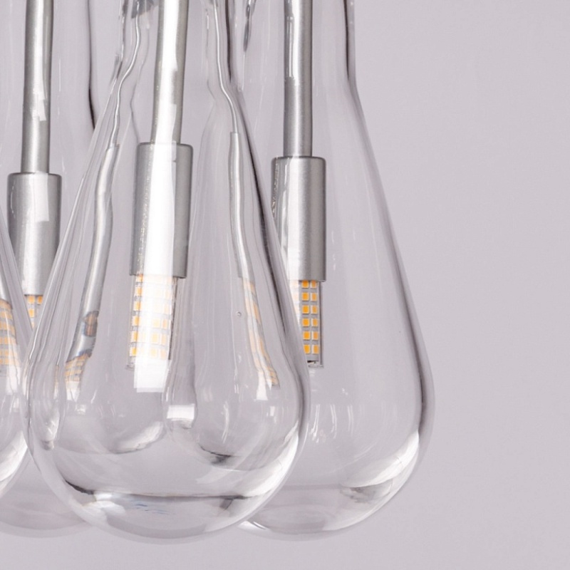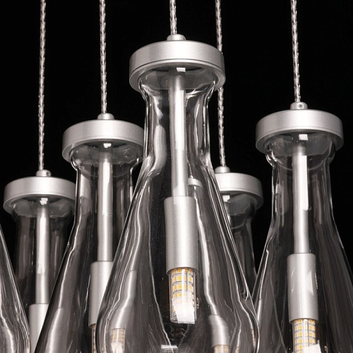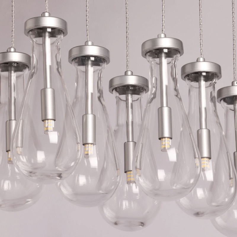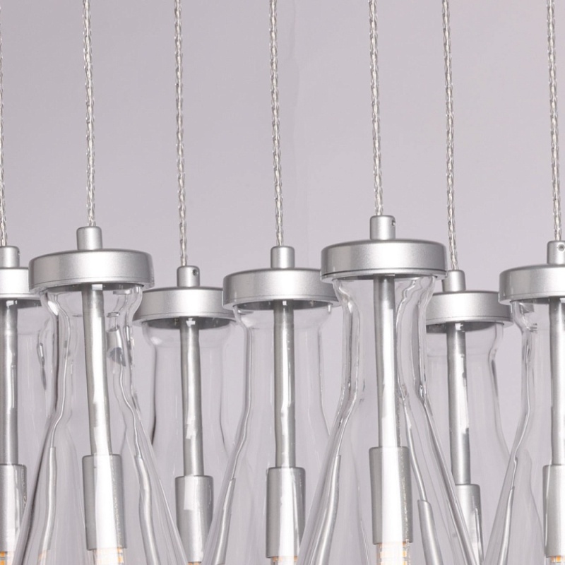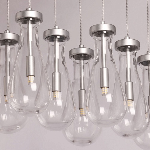 Металлическое основание подвесной люстры окрашено в цвет матового серебра. Светильник декорирован оригинальными плафонами обтекаемой формы, выполненными из прозрачного, выдувного вручную стекла