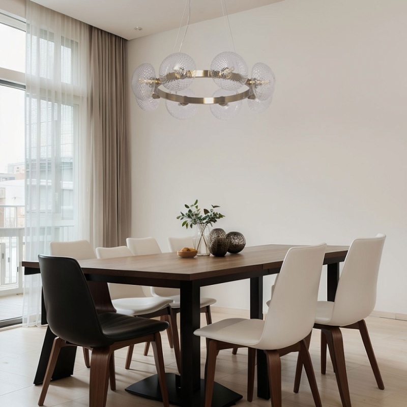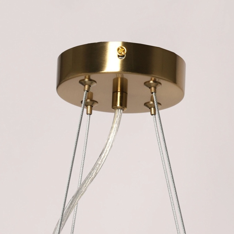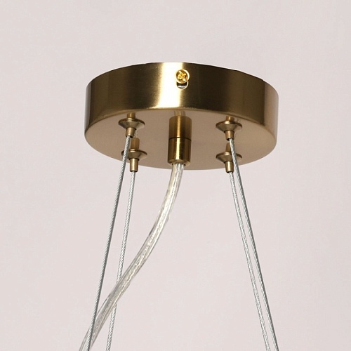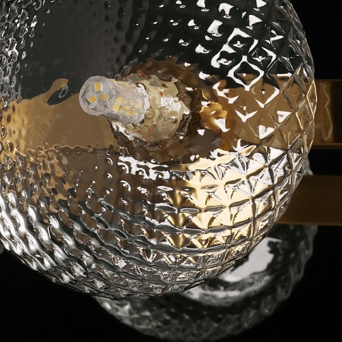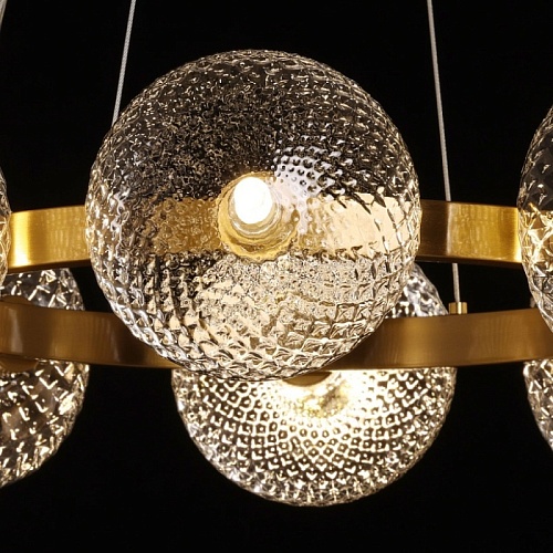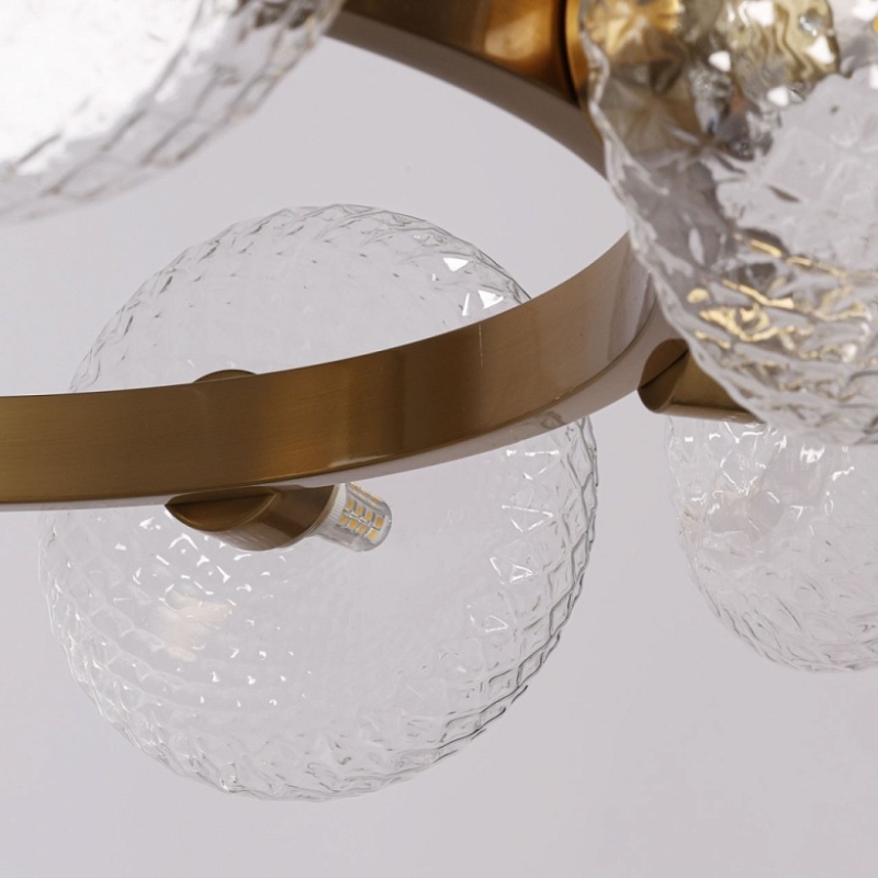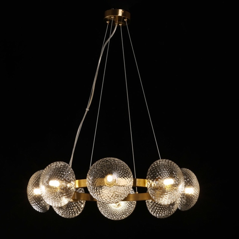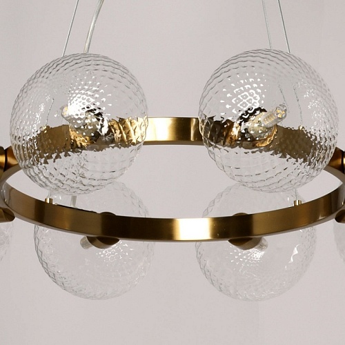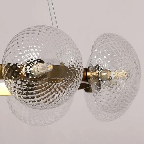 Металлическое основание подвесной люстры гальванизировано в цвет латуни. Светильник декорирован полусферами из прозрачного фактурного стекла.
