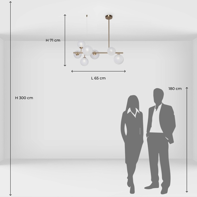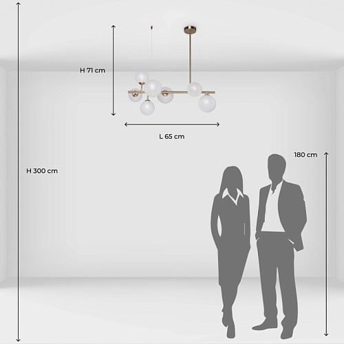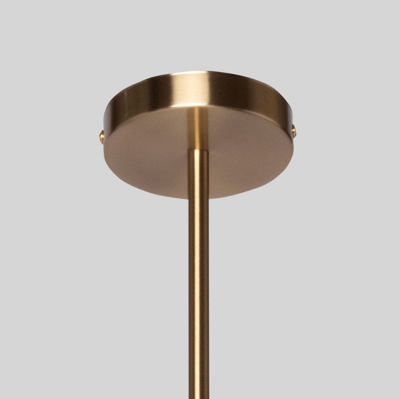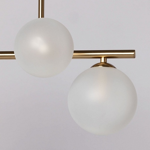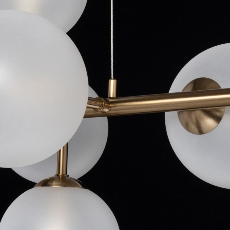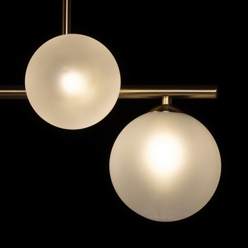Металлическое основание подвесной люстры гальванизировано в цвет латуни. Стеклянные плафоны выдуваются в форму вручную и матируются.