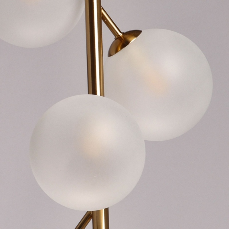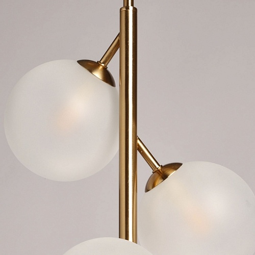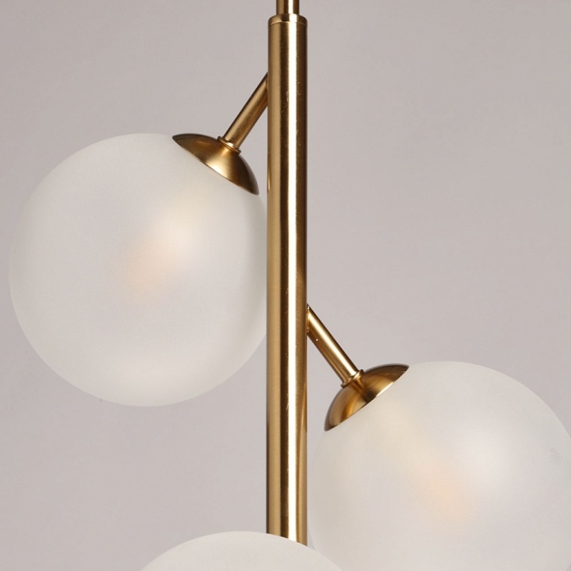 Металлическое основание подвесной люстры гальванизировано в цвет латуни. Стеклянные плафоны выдуваются в форму вручную и матируются.