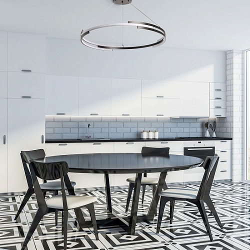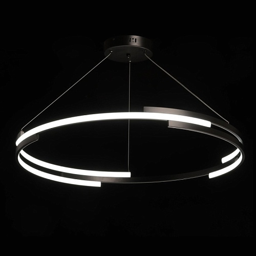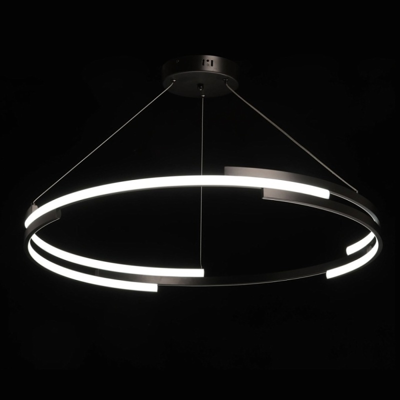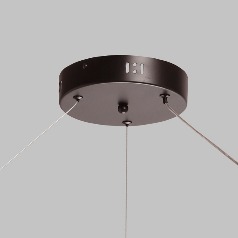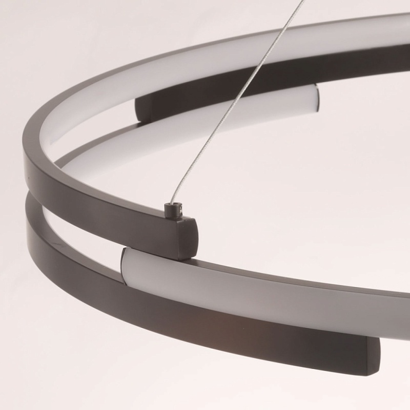 Металлическая потолочная чаша подвесной люстры окрашена в черный цвет. Плафон выполнен из сплава алюминия с цинком и окрашен в цвет основания. Светодиодные источники света закрыты белым матовым силиконом.