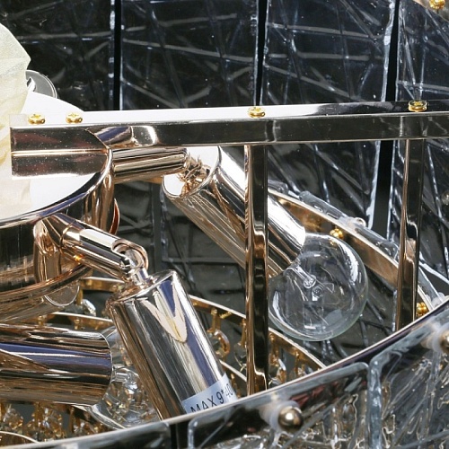Основание светильника выполнено из металла и гальванизировано в цвет золота. Светильник декорирован оригинальным плафоном, состоящим из стеклянных прозрачных фактурных пластин и гальванизированным в цвет шампань хрусталем.