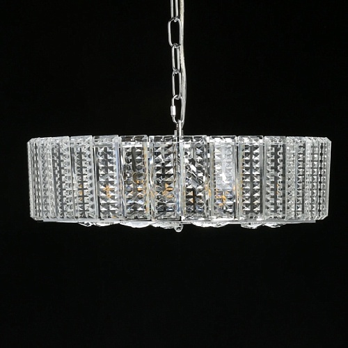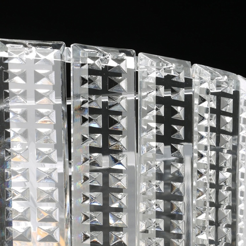 Металлическое основание светильника гальванизировано в цвет хрома. Светильник декорирован прозрачным фактурным стеклом и хрустальными элементами в форме дубового листа.