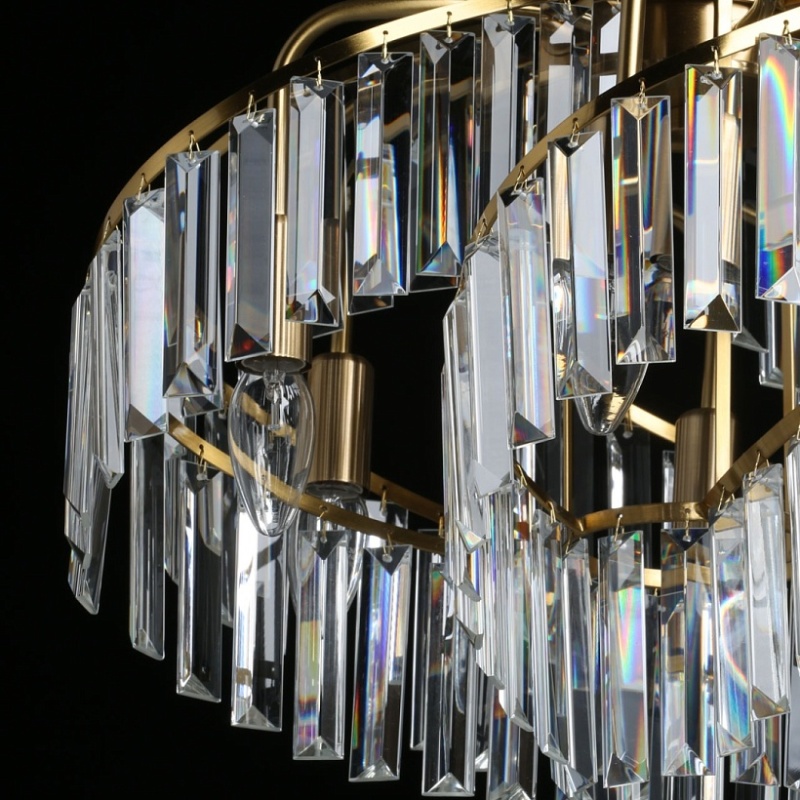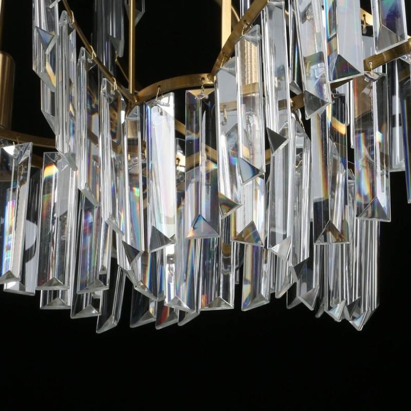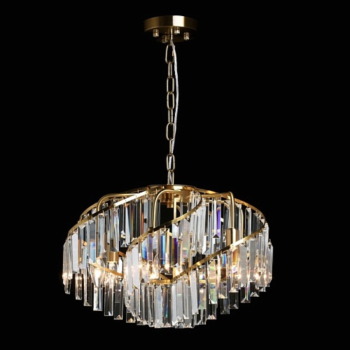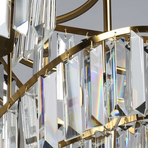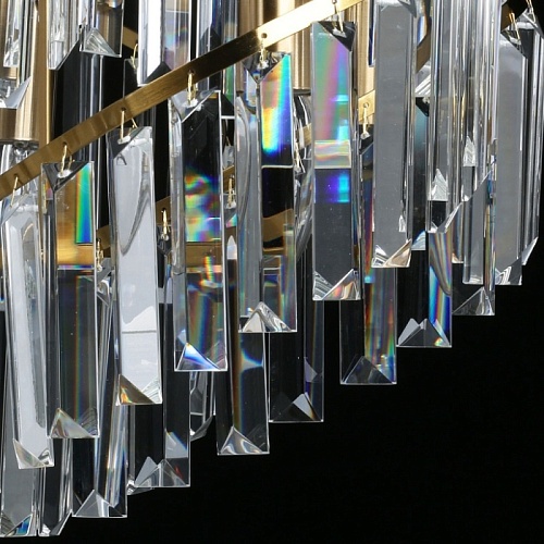 Металлическое основание светильника гальванизировано в цвет золота. Светильник декорирован прозрачным хрусталем вытянутой формы.