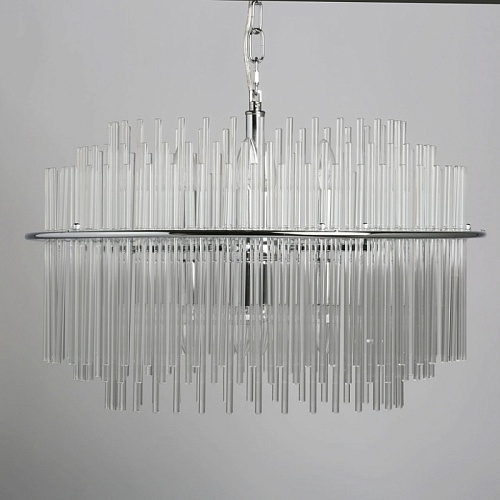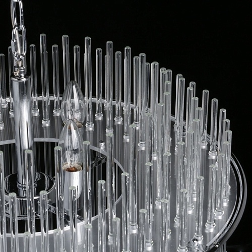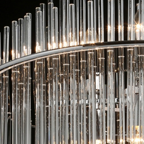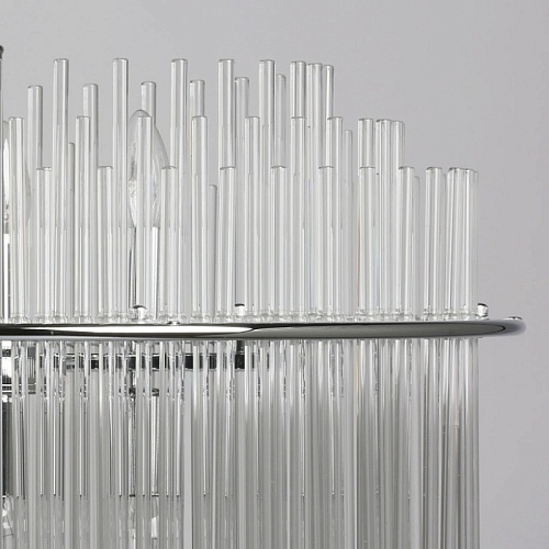 Металлическое основание светильника гальванизировано в цвет хрома. Светильник декорирован прозрачным стеклом в виде трубочек. Стеклянный декор крепится на пластину из нержавеющей стали, отполированной до зеркального блеска.