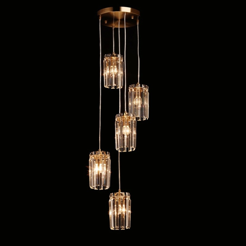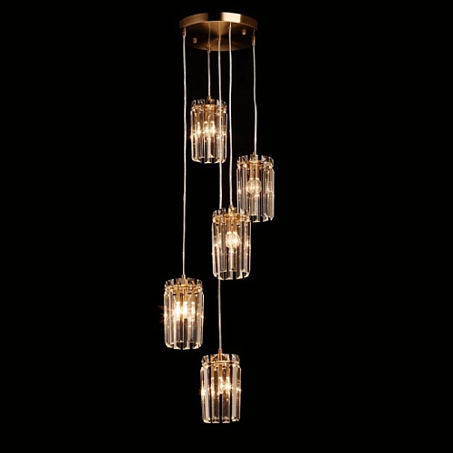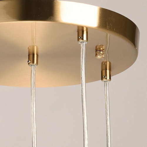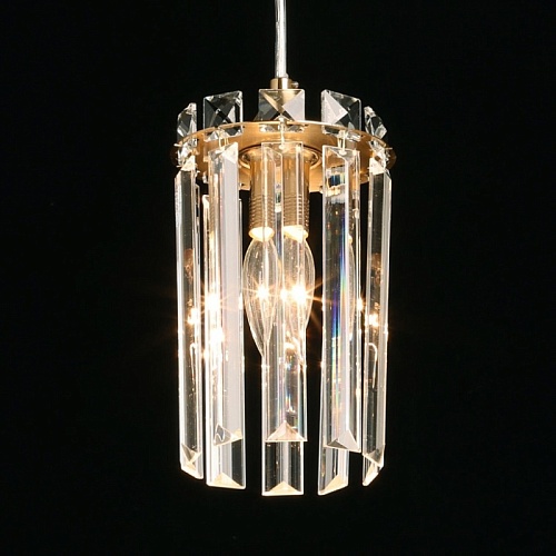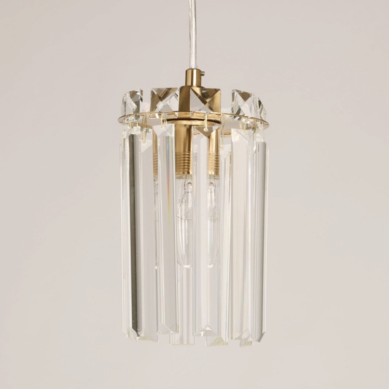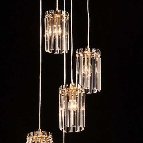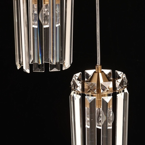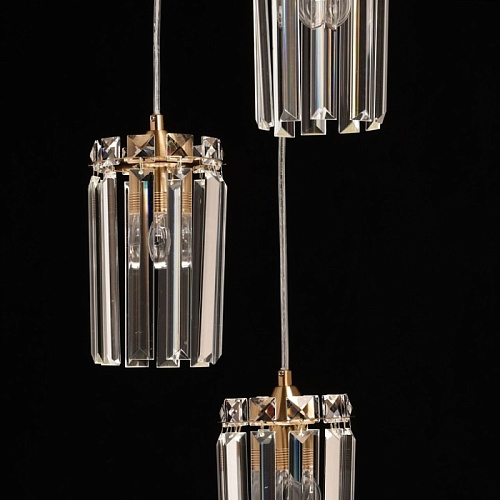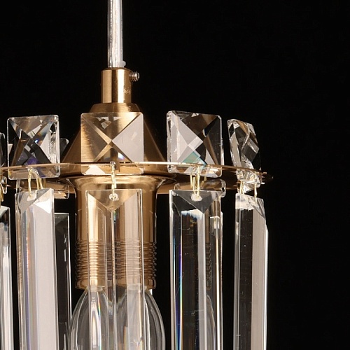 Металлическое основание подвесной люстры гальванизировано в цвет латуни. Светильник декорирован подвесками из прозрачного хрусталя вытянутой формы.