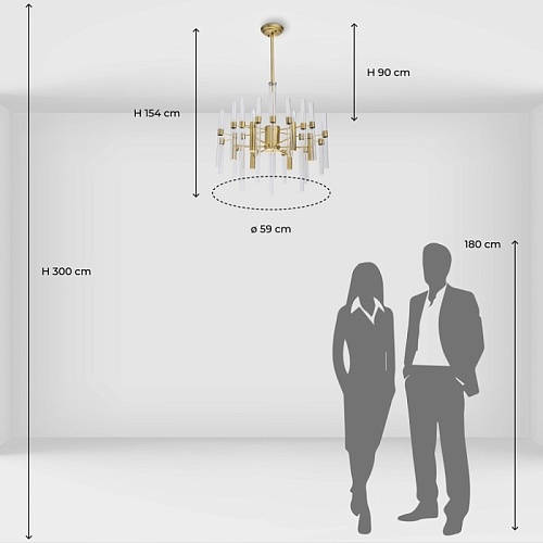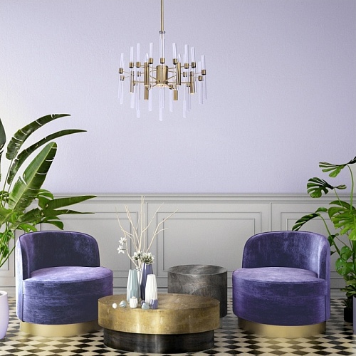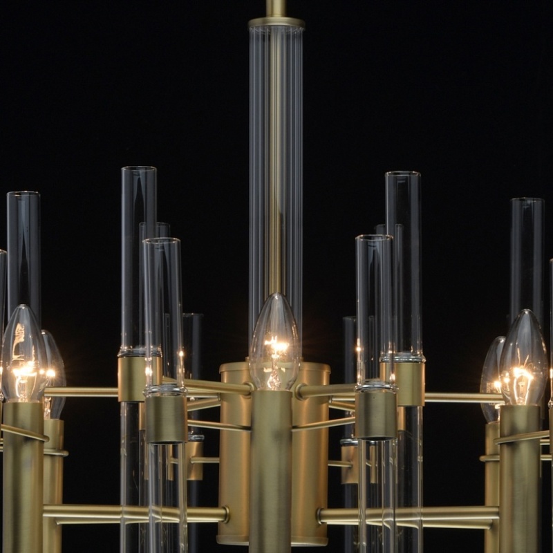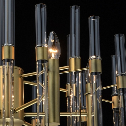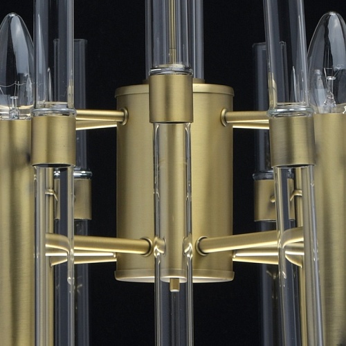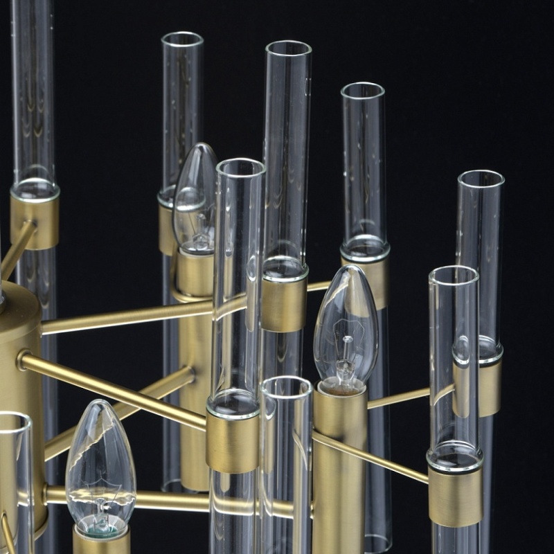 Основание светильника выполнено из металла и гальванизировано в цвет латуни с патинированием. Декор в виде стеклянных полых трубок.