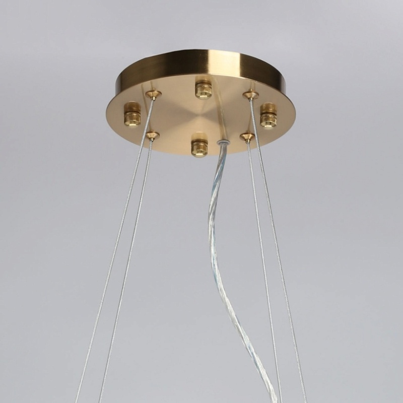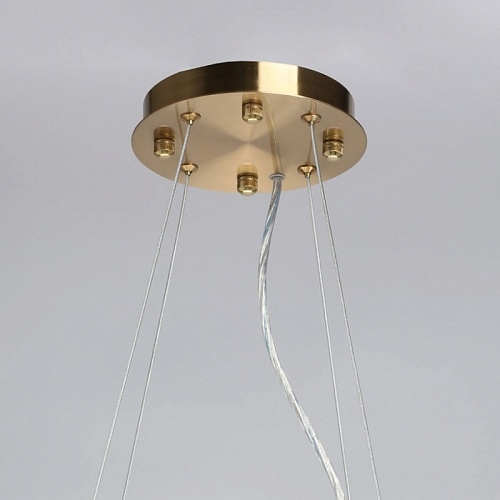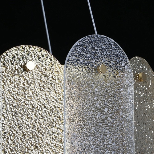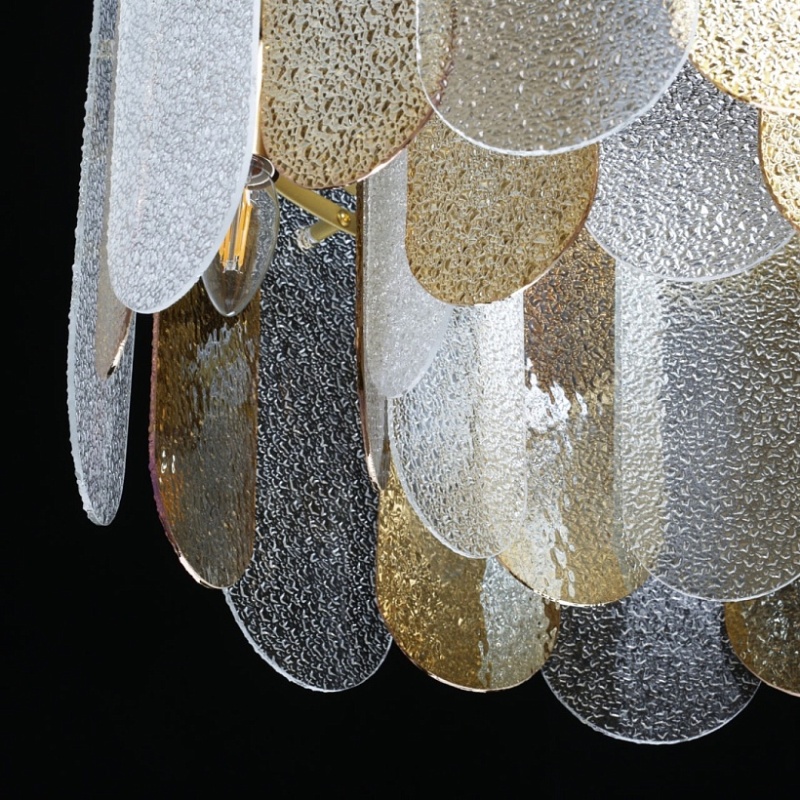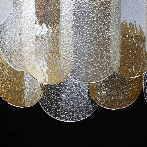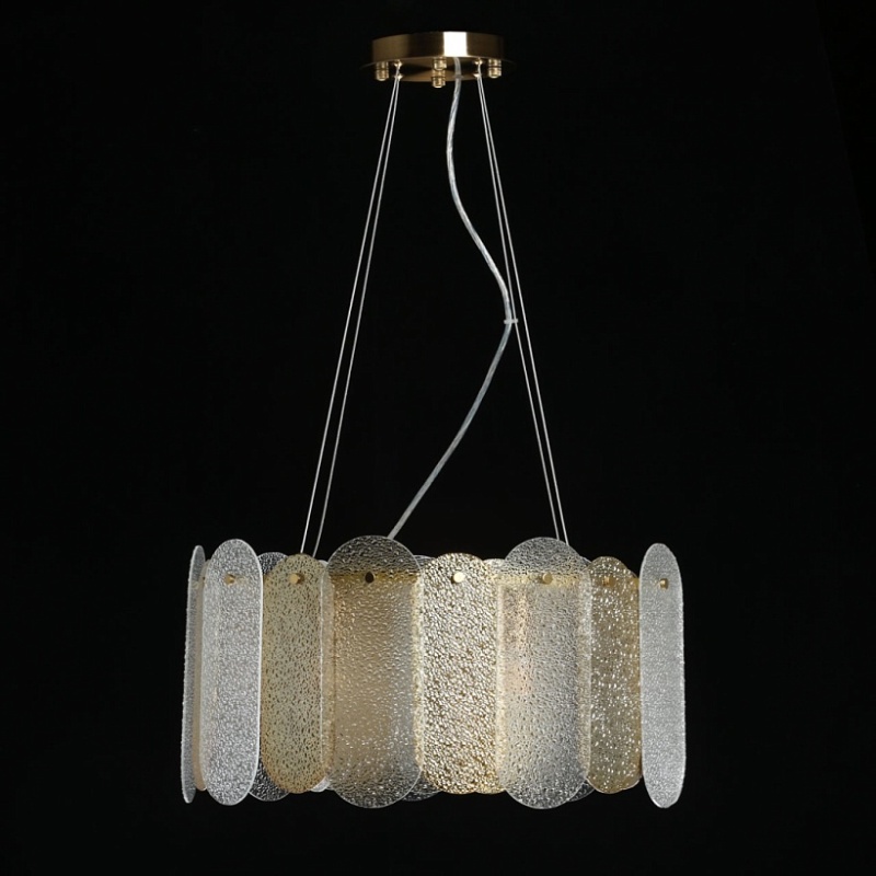 Металлическое основание подвесной люстры гальванизировано в цвет бронзы. Светильник декорирован фактурным прозрачным стеклом и стеклом цвета шампань.