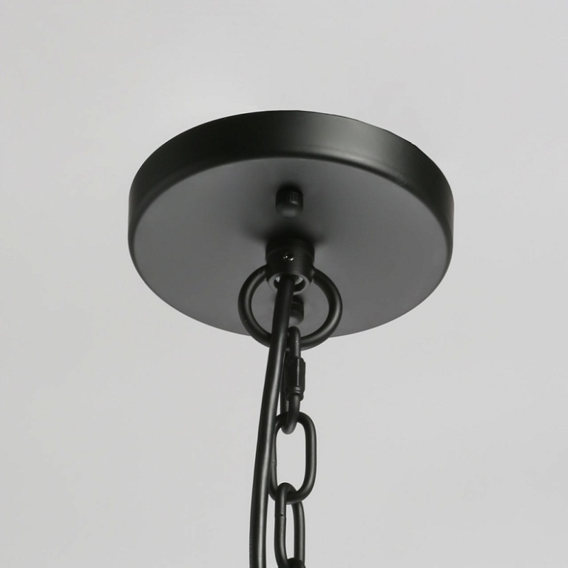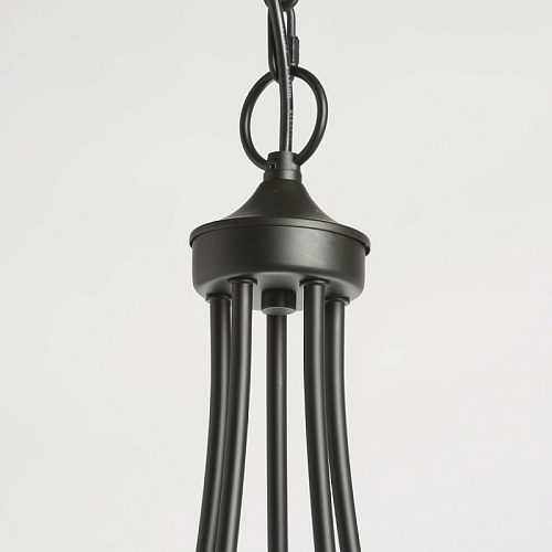 Металлическое основание окрашено в черный цвет. Отдельные элементы основания гальванизированы в цвет бронзы. Светильник декорирован плафонами из прозрачного фактурного стекла.