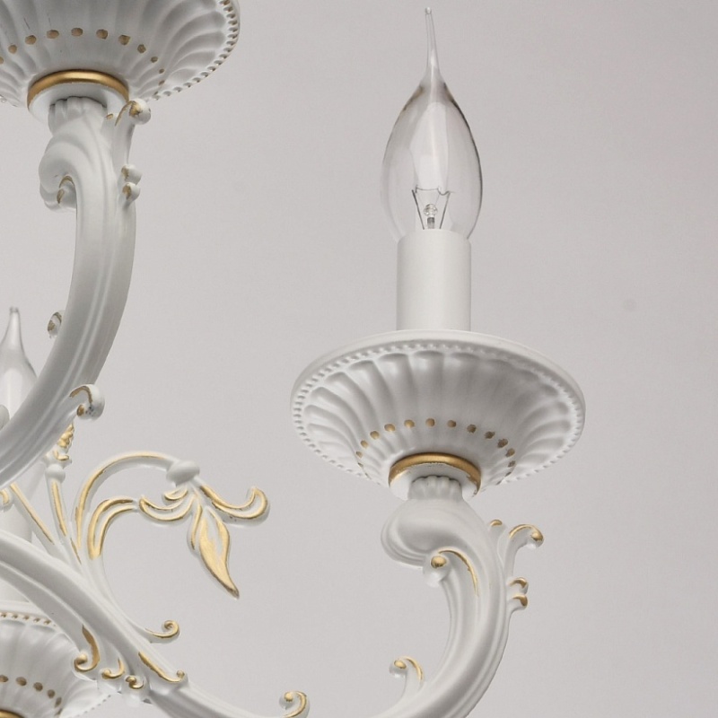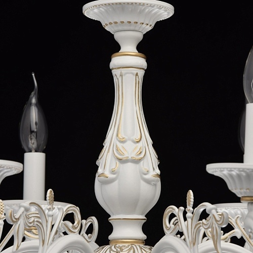 Основание: комбинация сплавов металлов.Основание обработана по технологии ручного окрашивания: основной цвет слоновой кости, выступающие части окрашены в цвет золота. Потолочная чаша, декоративные розетки, корпус: металл, прессование.Рожки, центральный стержень: сплав алюминия, художественное литье.