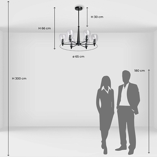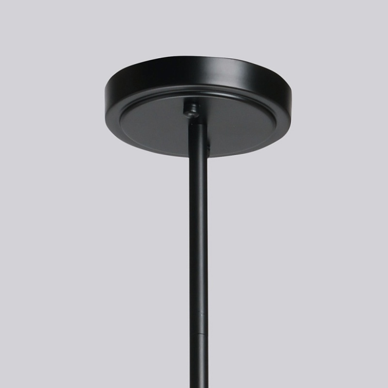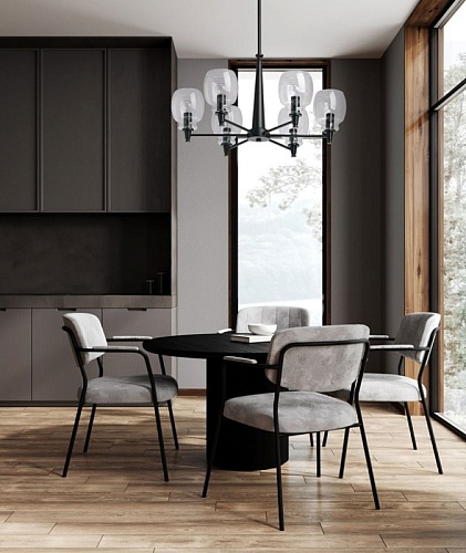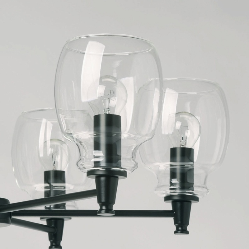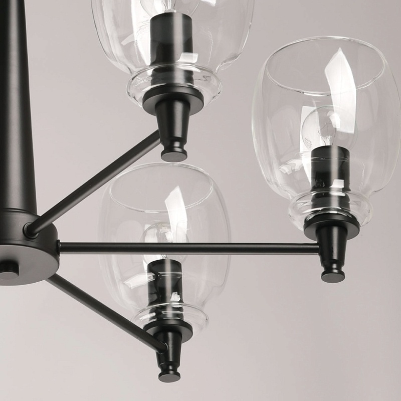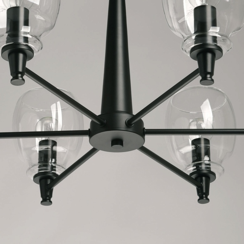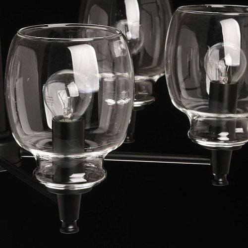 Металлическое основание люстры окрашено в черный цвет. Прозрачные стеклянные плафоны отлиты в сложную форму. В комплект люстры входит 2 типа крепления: потолочный вариант и 2 штанги для подвесного формата.