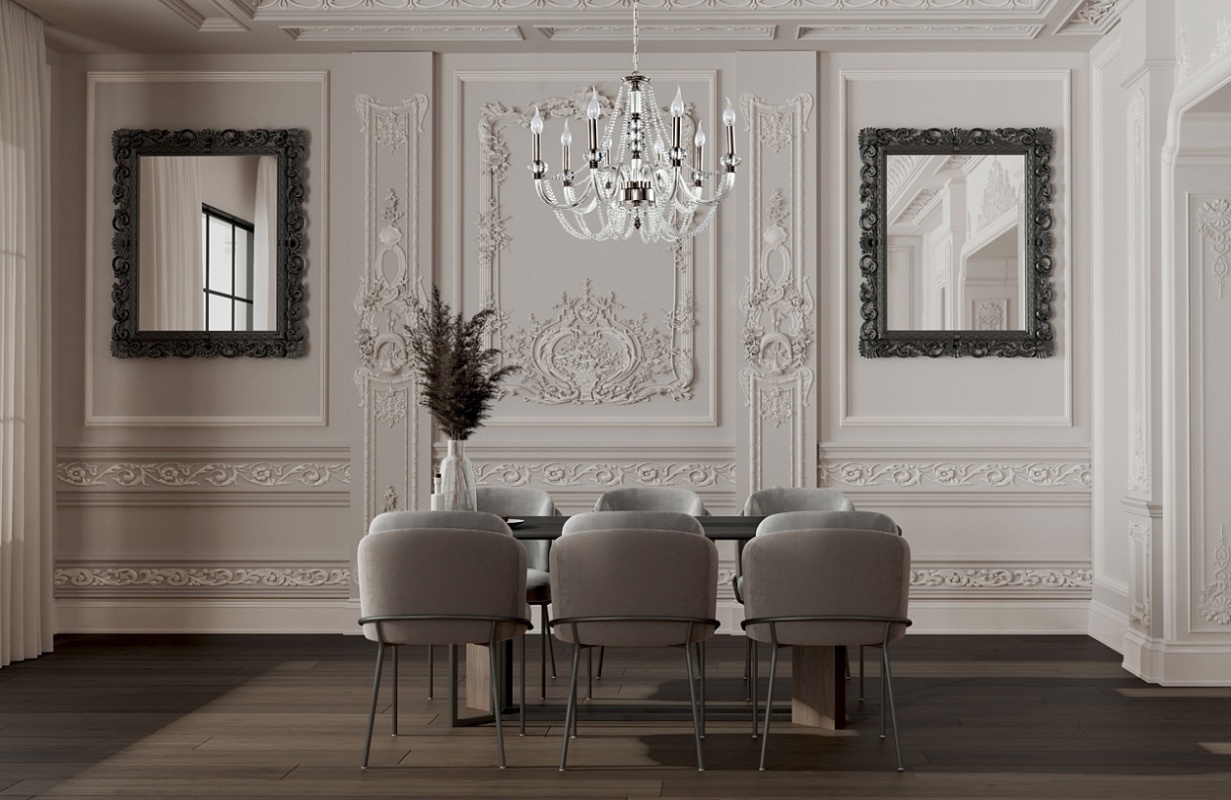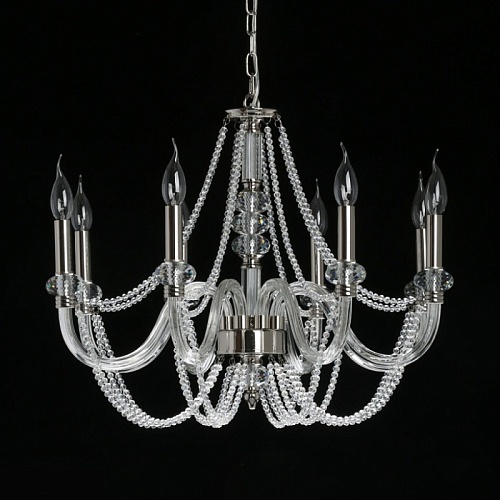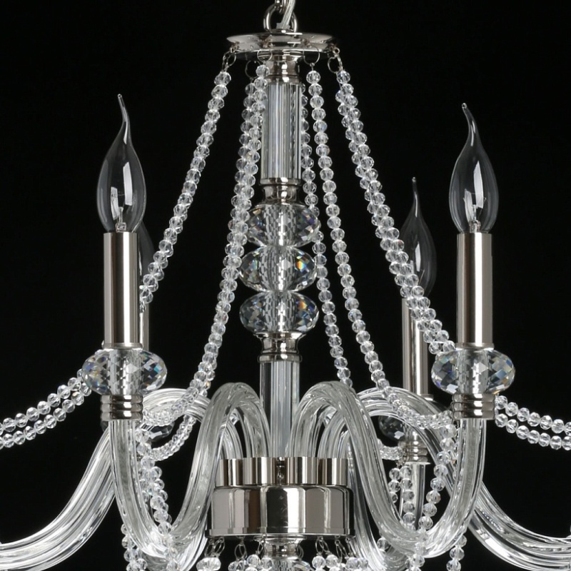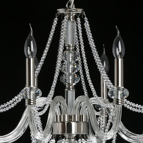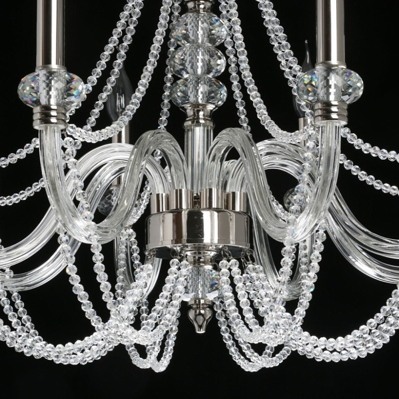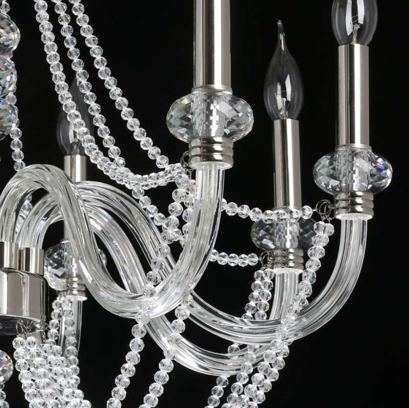 Металлическое основание гальванизировано в цвет никеля. Рожки выполнены из прозрачного выдувного стекла. Центральная ось и рожки декорированы прозрачным массивом хрусталя. Светильник декорирован хрустальными бусами.
