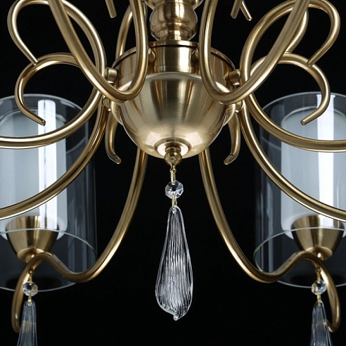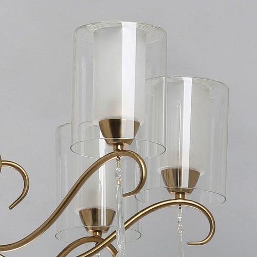 Металлическое основание светильника гальванизировано в цвет бронзы. Двойные стеклянные плафоны, отлиты в сложную форму. Внутренний плафон матирован, внешний - прозрачный. Светильник декорирован прозрачным хрусталем оригинальной формы.