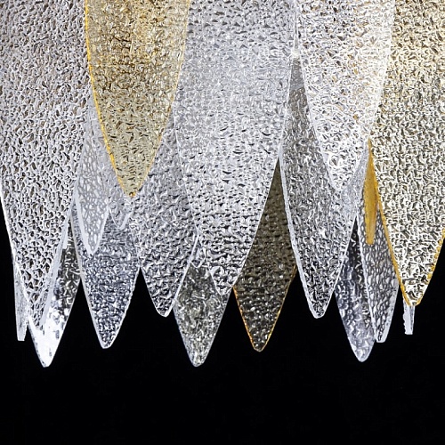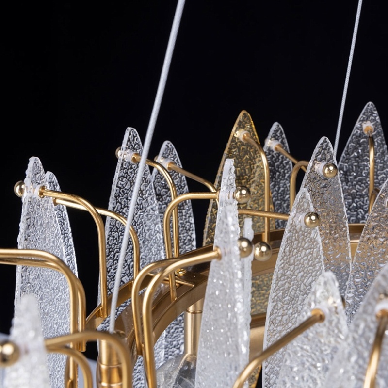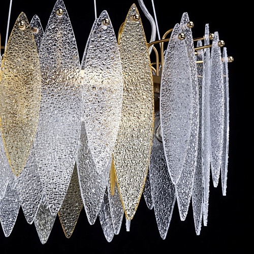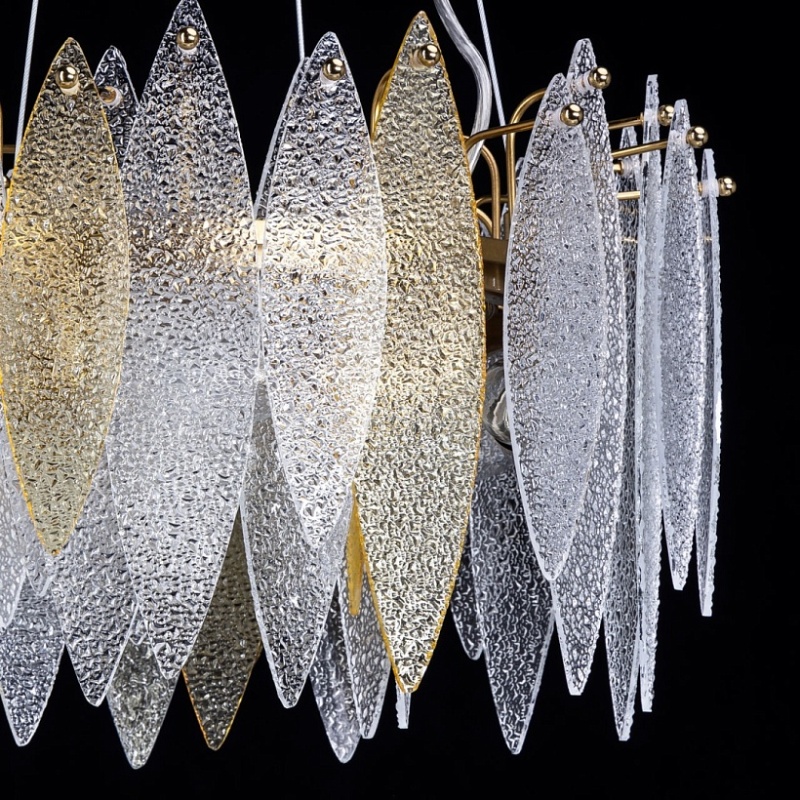 Металлическое основание подвесного светильника гальванизировано в цвет латуни. Люстра декорирована фактурными стеклянными пластинами прозрачными и цвета шампань.