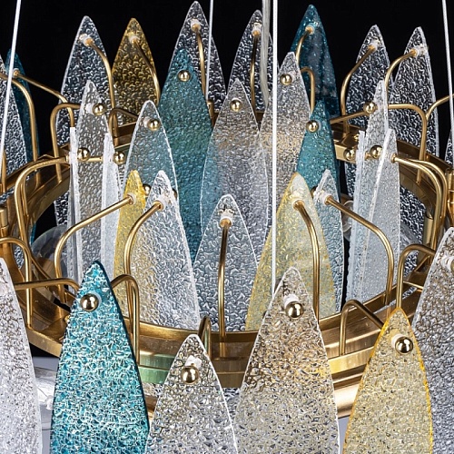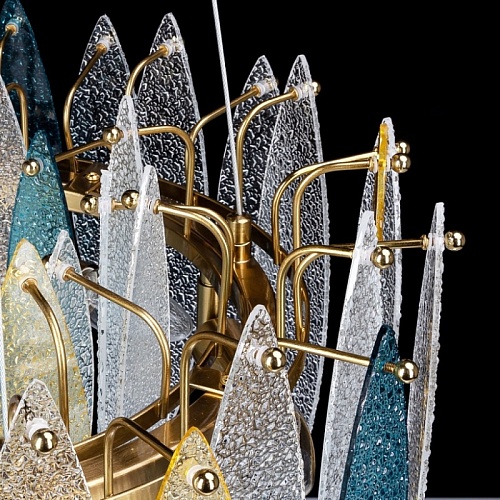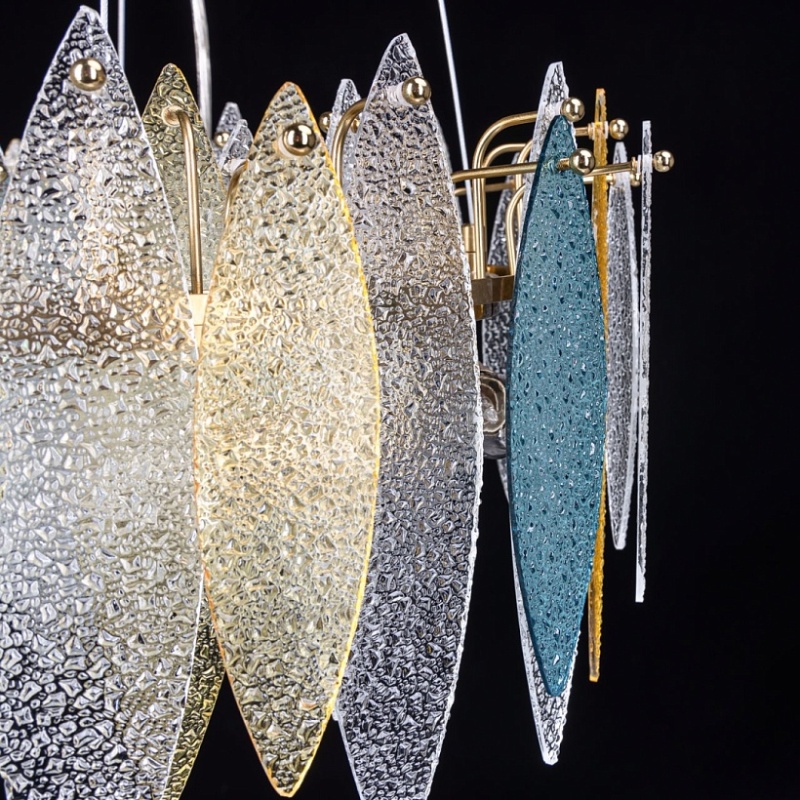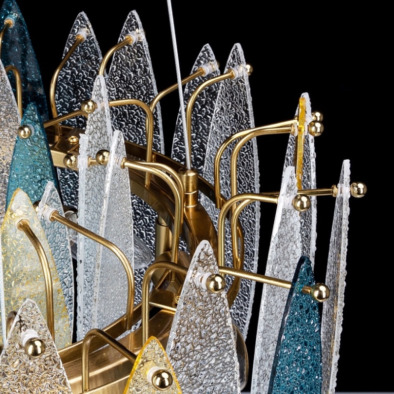 Металлическое основание подвесного светильника гальванизировано в цвет латуни. Люстра декорирована фактурными стеклянными пластинами прозрачными, голубого цвета и цвета шампань.
