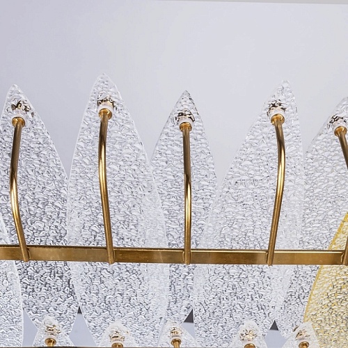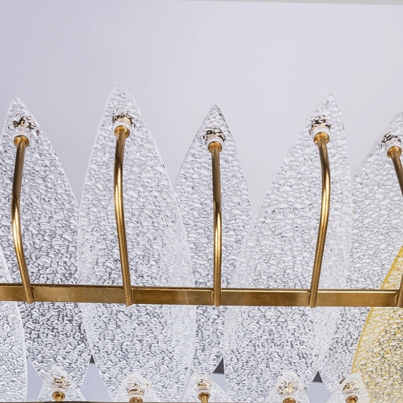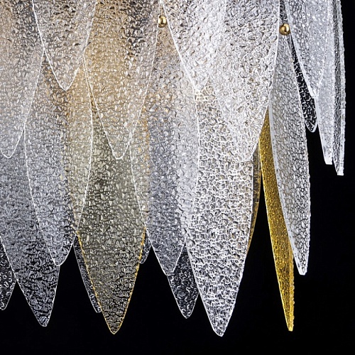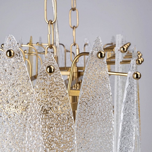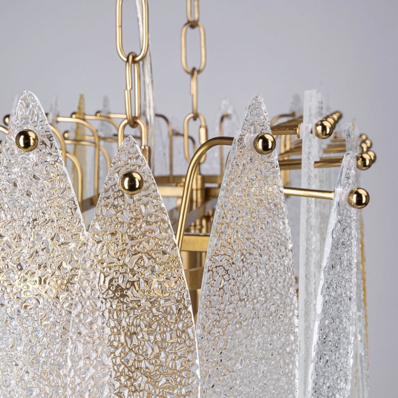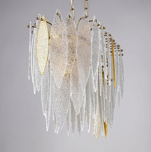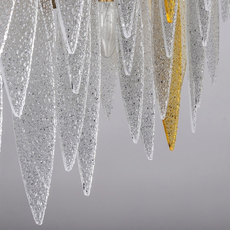 Металлическое основание подвесного светильника гальванизировано в цвет латуни. Люстра декорирована фактурными стеклянными пластинами прозрачными и цвета шампань.