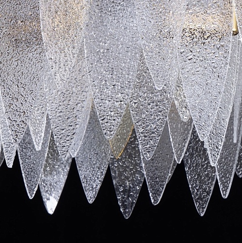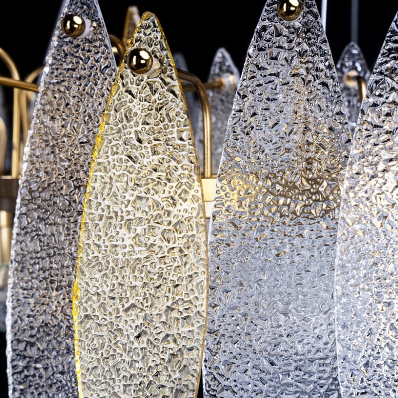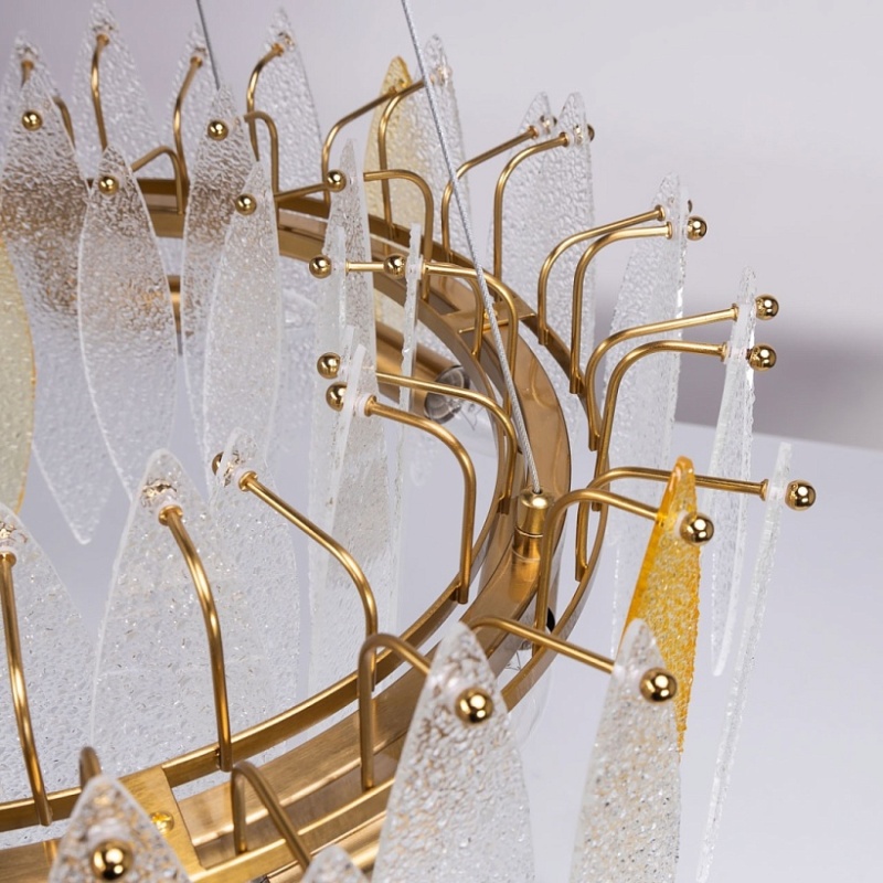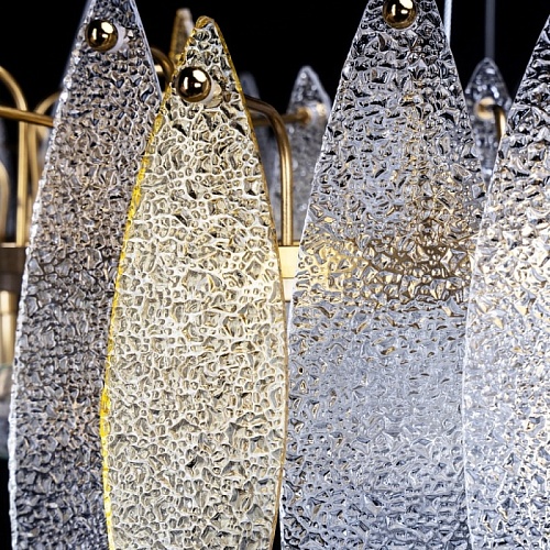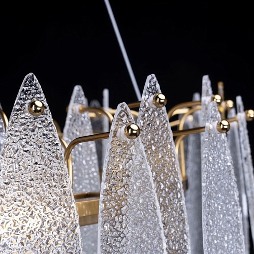 Металлическое основание подвесного светильника гальванизировано в цвет латуни. Люстра декорирована фактурными стеклянными пластинами прозрачными и цвета шампань.