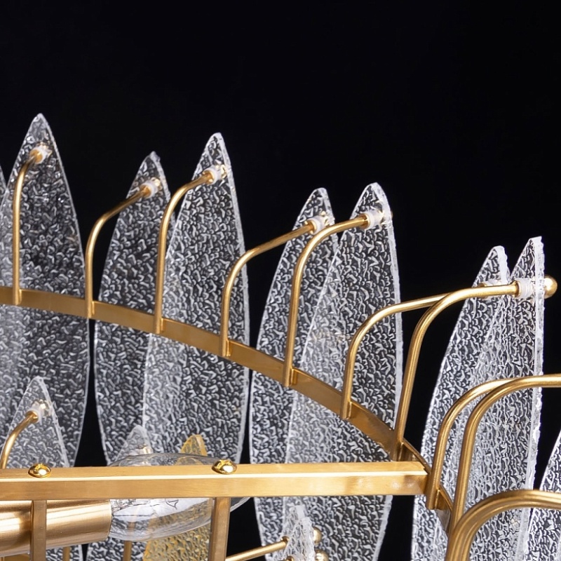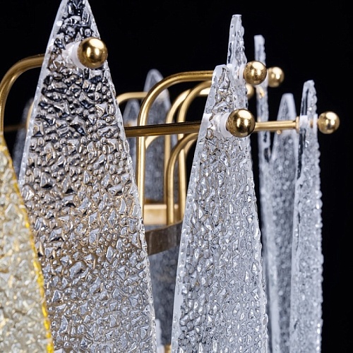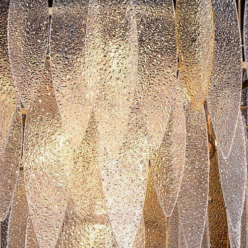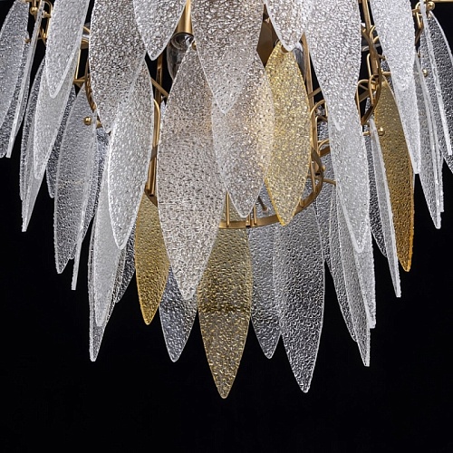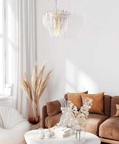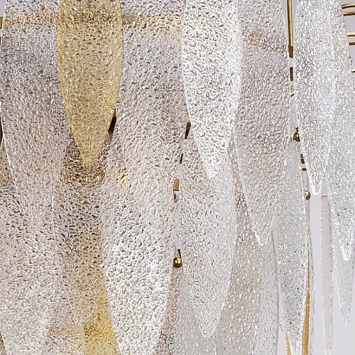 Металлическое основание подвесного светильника гальванизировано в цвет латуни. Люстра декорирована фактурными стеклянными пластинами прозрачными и цвета шампань.