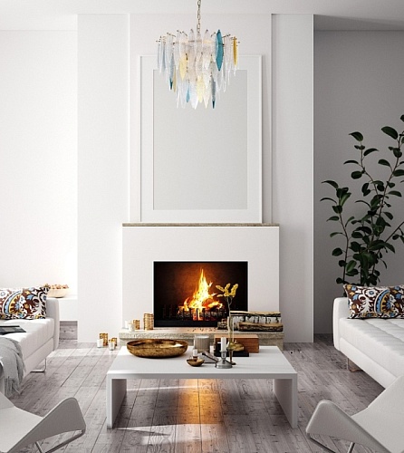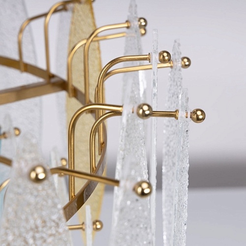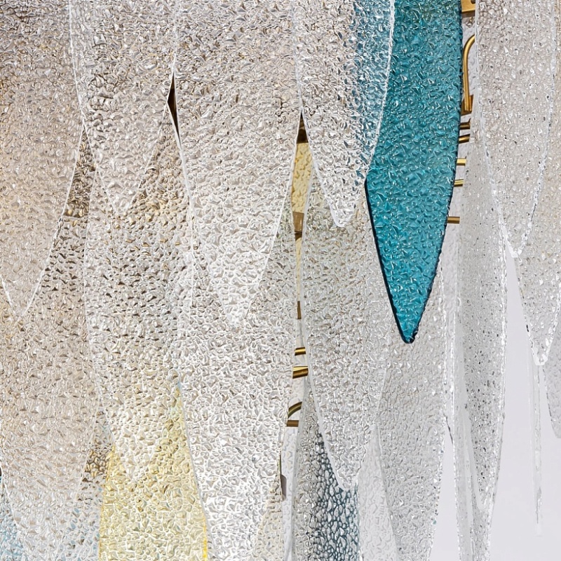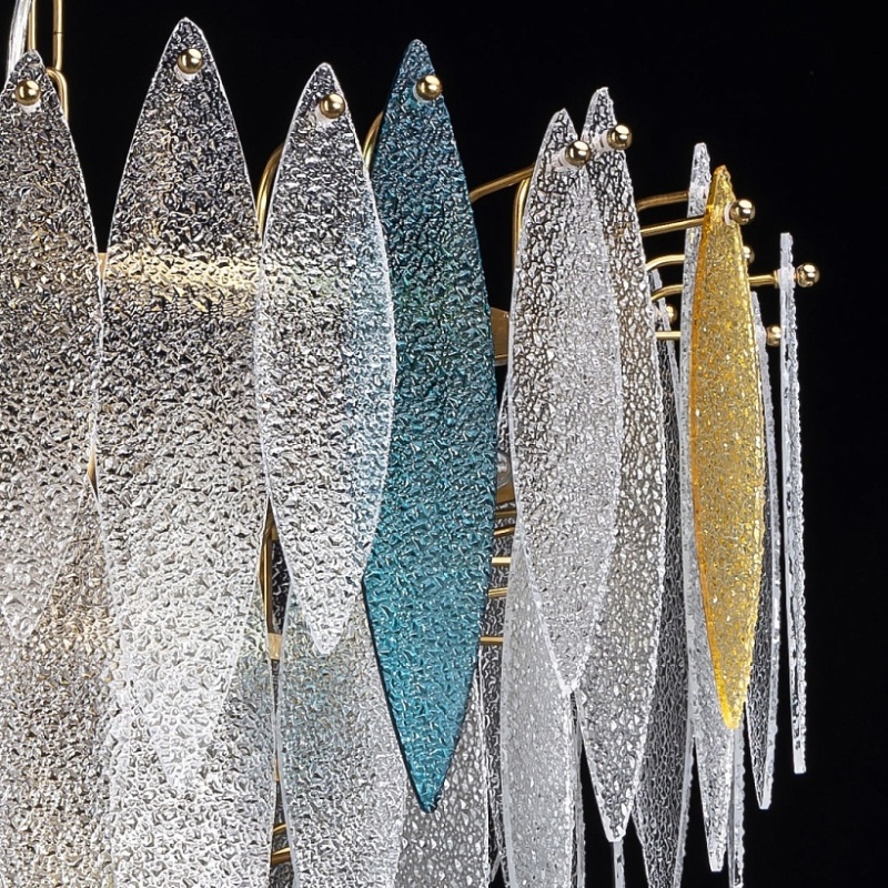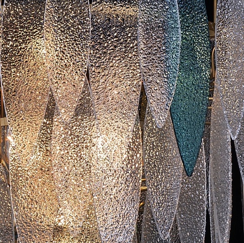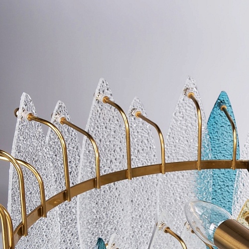 Металлическое основание подвесного светильника гальванизировано в цвет латуни. Люстра декорирована фактурными стеклянными пластинами прозрачными, голубого цвета и цвета шампань.