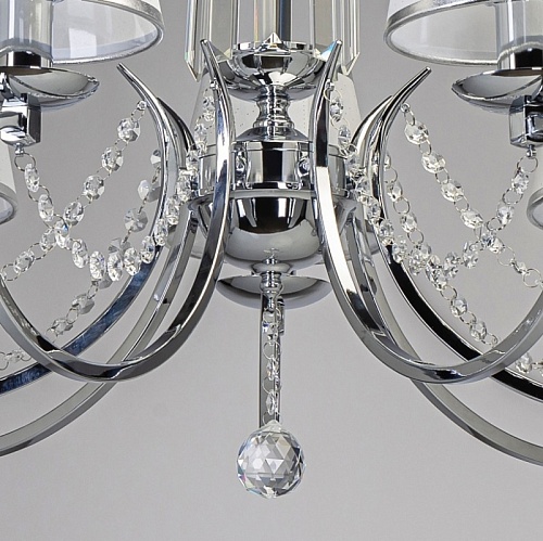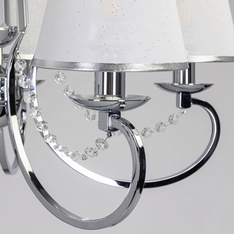 Металлическое основание подвесной люстры гальванизировано в цвет хрома. Двухслойные текстильные абажуры белого цвета отделаны кантом серебряного цвета. Люстра декорирована прозрачным хрусталем прямоугольной формы и формы октагон.