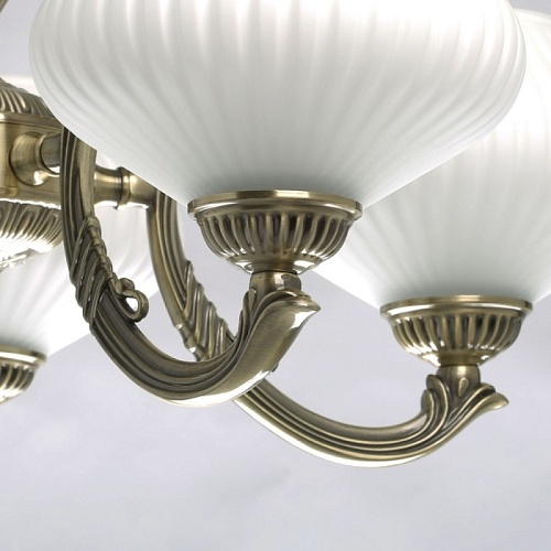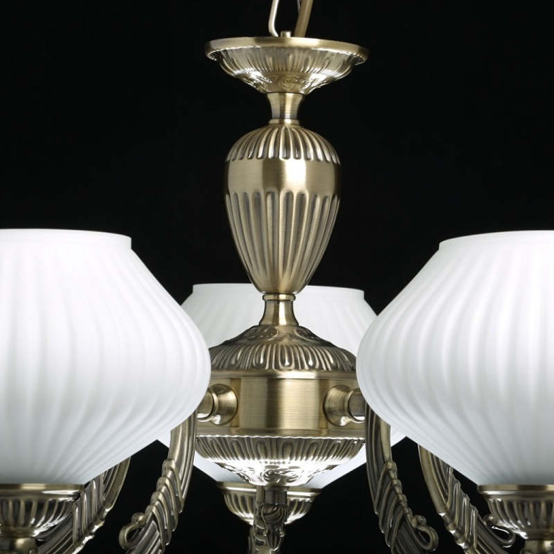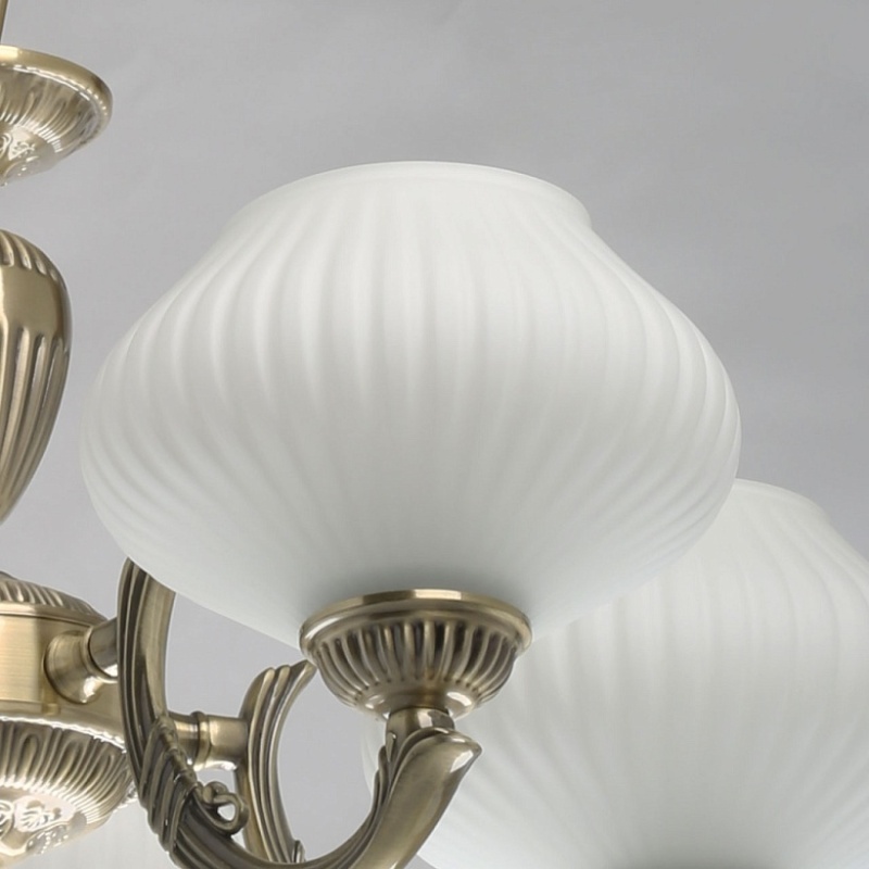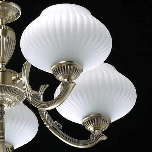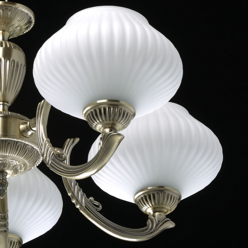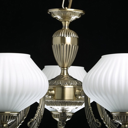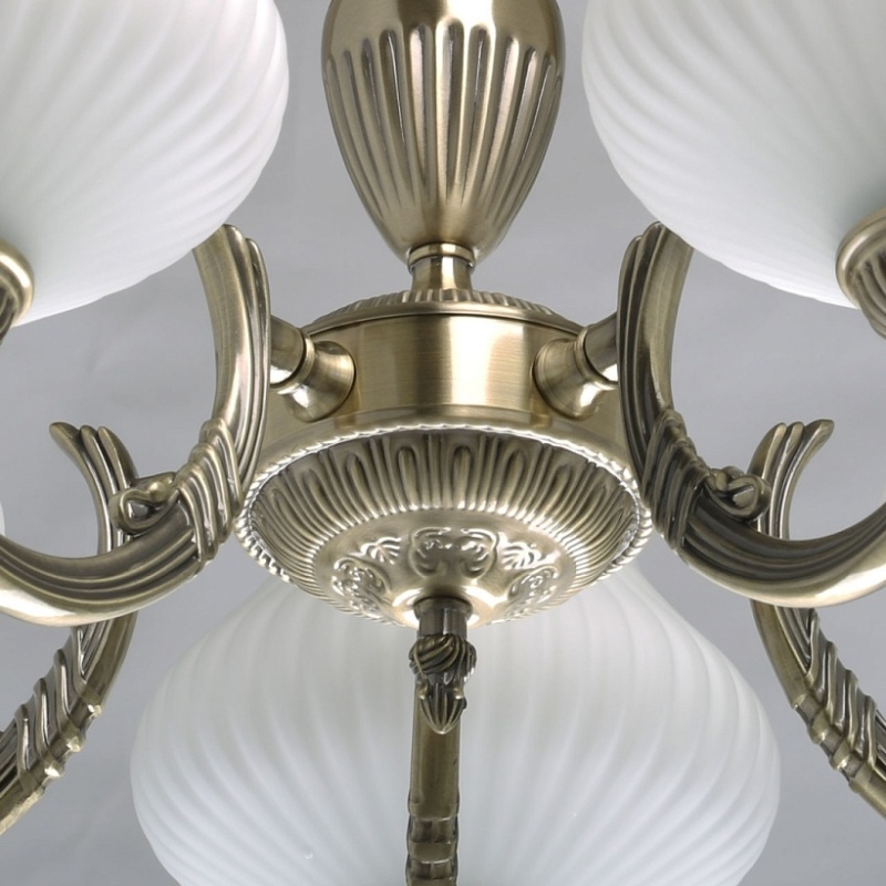Основание светильника выполнено из комбинации сплавов металлов и гальванизировано в цвет античной бронзы. Центральная ось и декоративная розетка выполнены из металла по технологии токарной обработки и опрессовки. Рожки выполнены из сплава алюминия с цинком по технологии художественного литья. Люстра декорирована выдувными в сложную форму стеклянными плафонами, окрашенными изнутри в белый цвет.