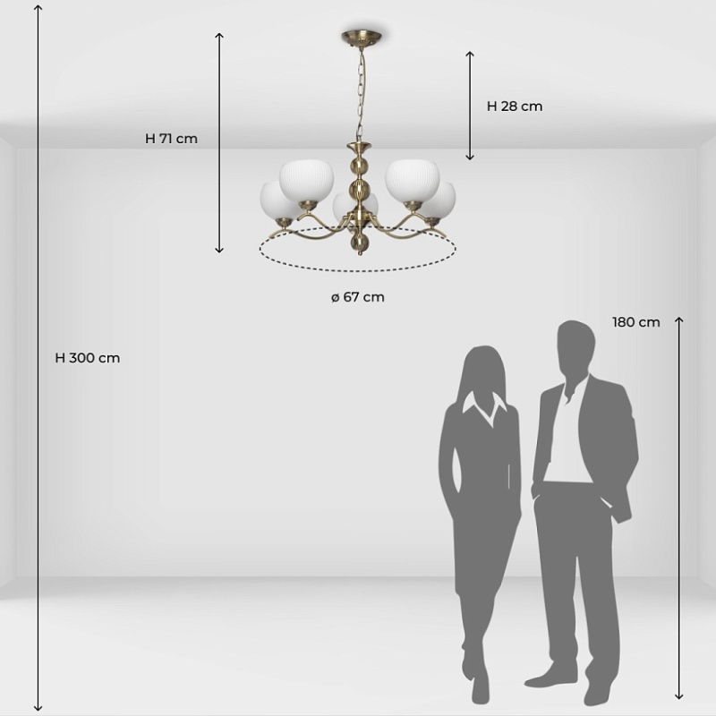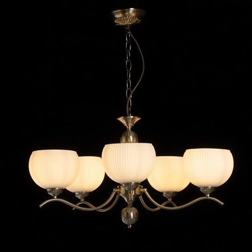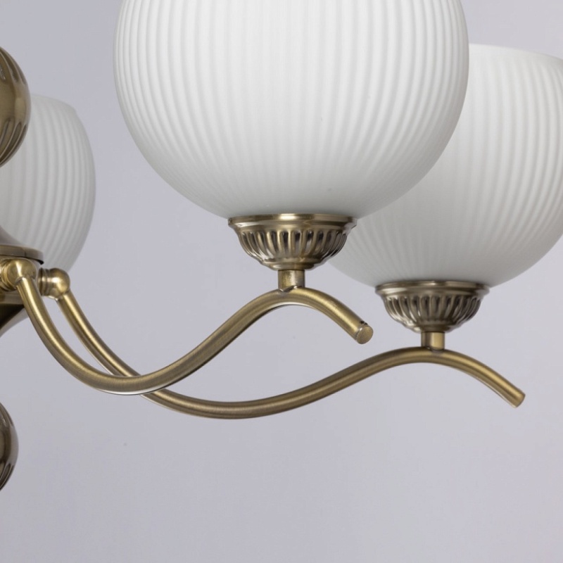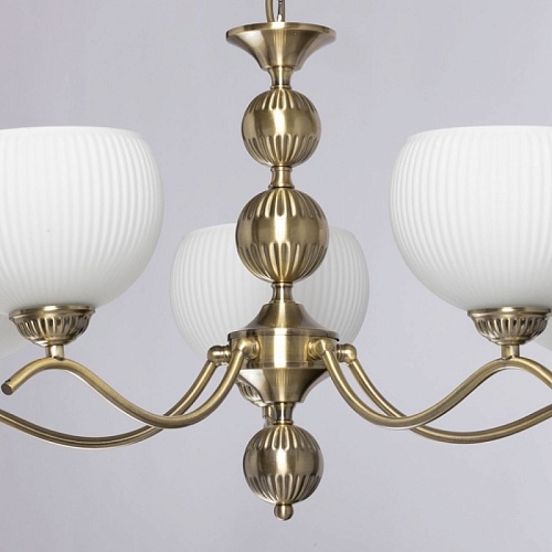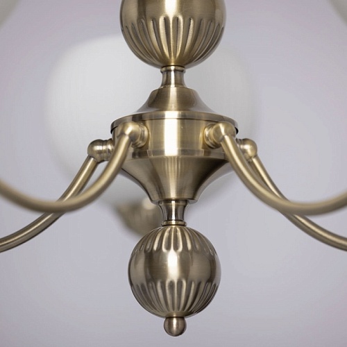 Металлическое основание подвесной люстры гальванизировано в цвет античной бронзы. Светильник декорирован стеклянными плафонами, отлитыми в сложную форму и окрашенными в белый цвет изнутри.