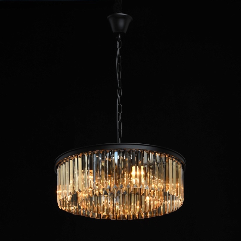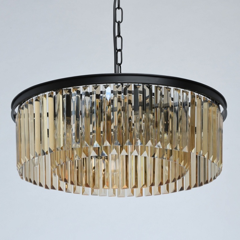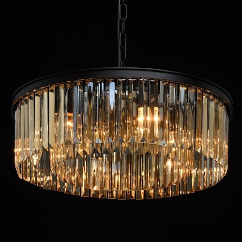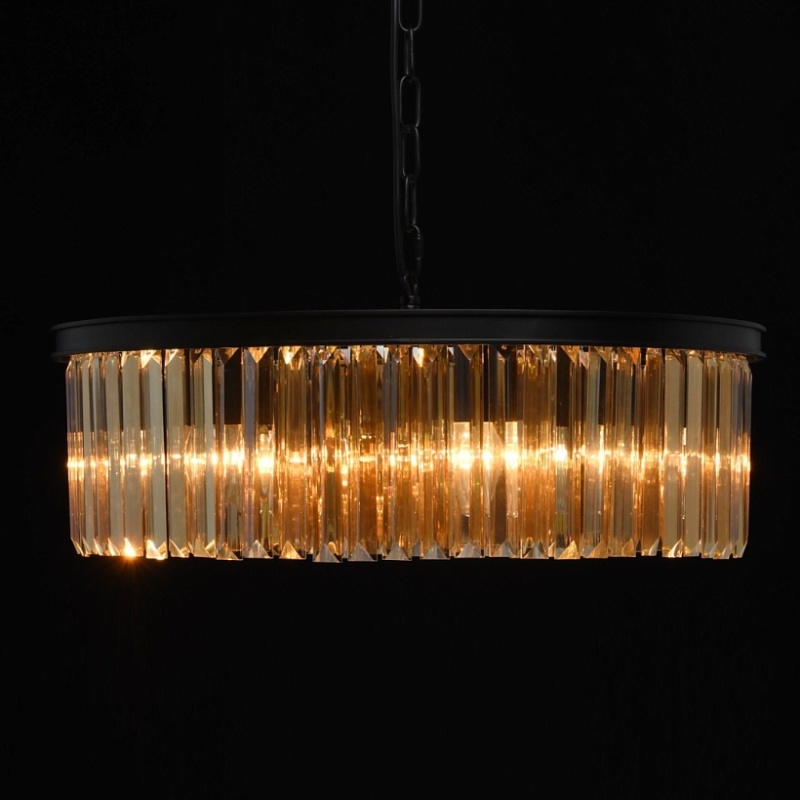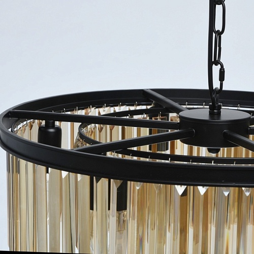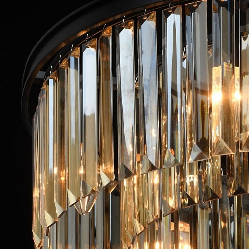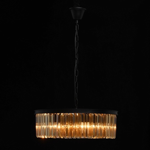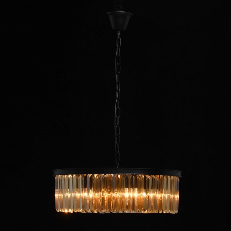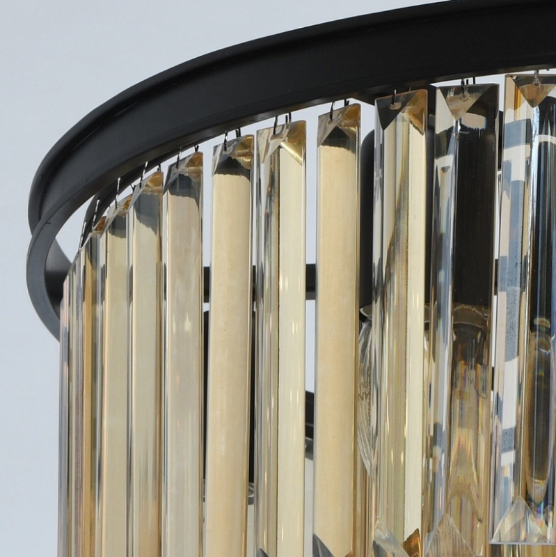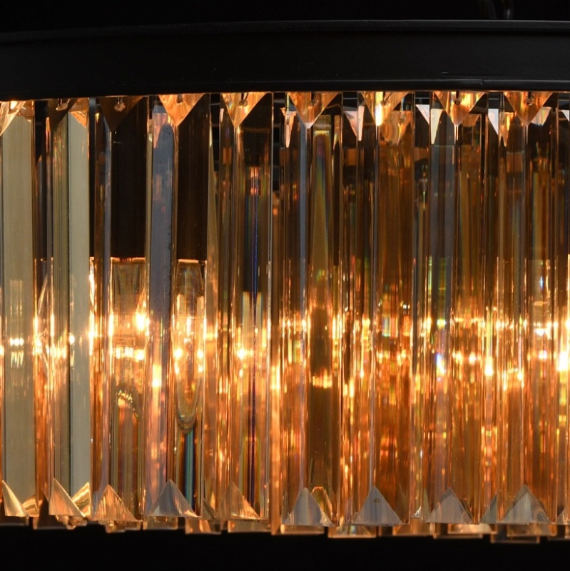 Основание выполнено из металла и окрашено в черный матовый цвет. Декоративные подвески из хрусталя прямоугольной формы, гальванизированного в цвет топаза.