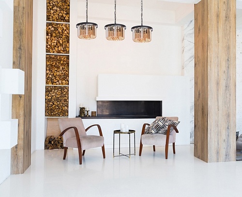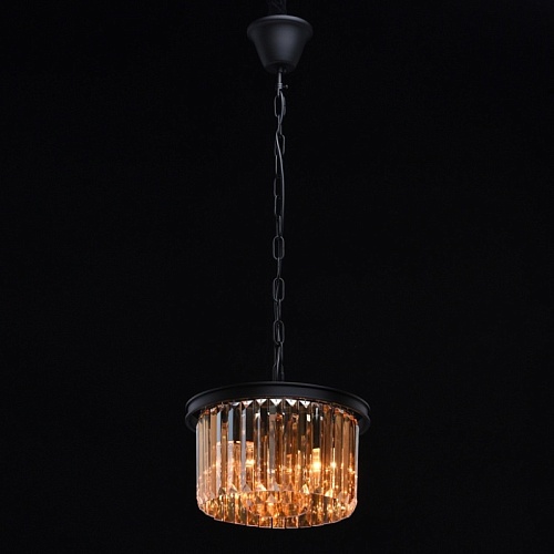 Основание выполнено из металла и окрашено в черный матовый цвет. Декоративные подвески из хрусталя прямоугольной формы, гальванизированного в цвет топаза.