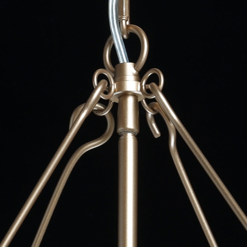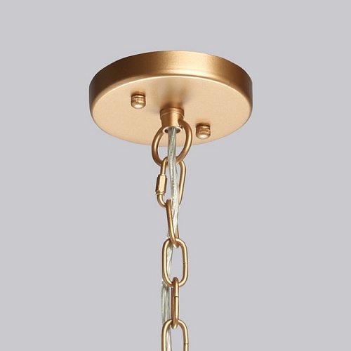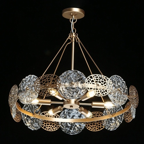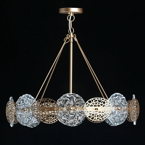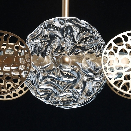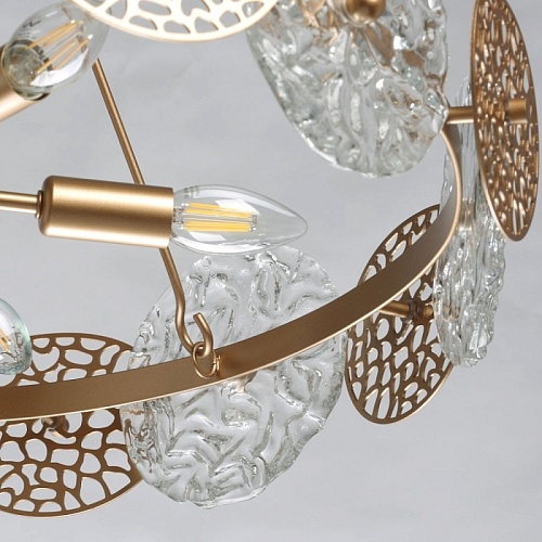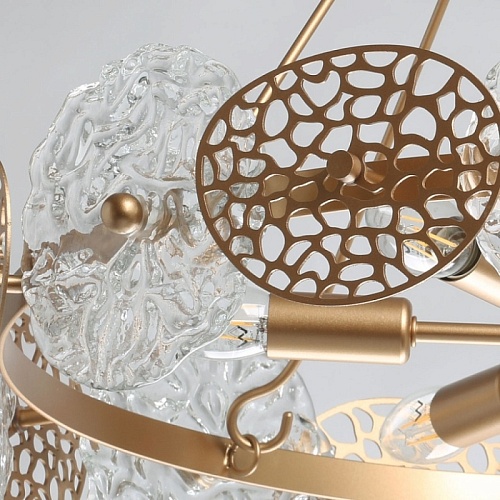 Металлическое основание светильника окрашено в матовый золотой цвет. Светильник декорирован округлыми элементами неправильной формы из фактурного прозрачного стекли и из металла, окрашенного в цвет основания.