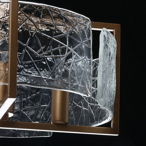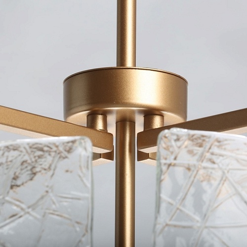 Металлическое основание светильника гальванизировано в цвет золота. Светильник декорирован прозрачными пластинами из фактурного стекла.