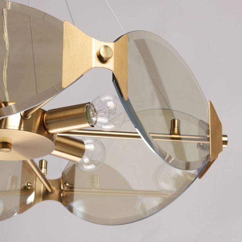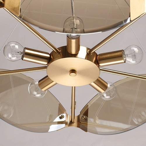 Металлическое основание подвесной люстры гальванизировано в цвет латуни. Люстра декорирована стеклянными элементами, гальванизированными в цвет шампань.