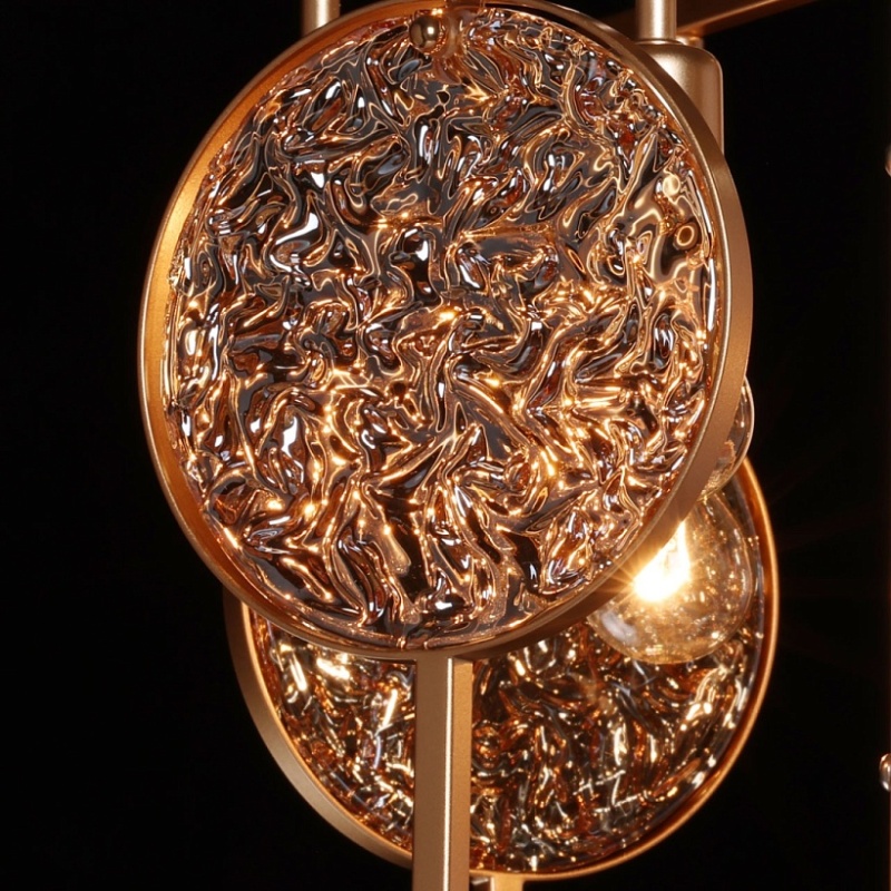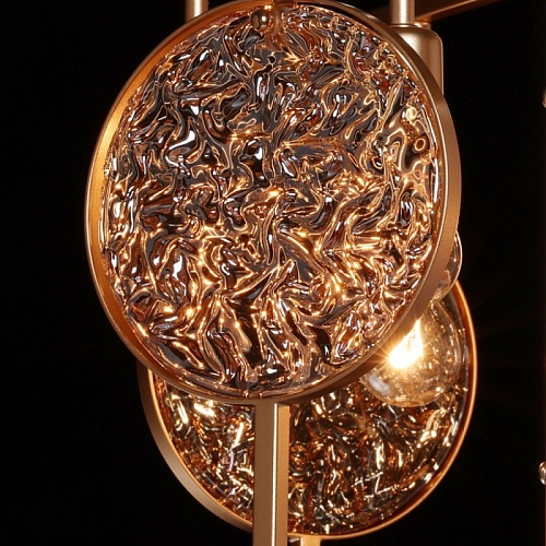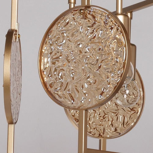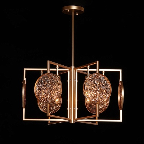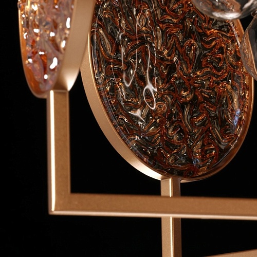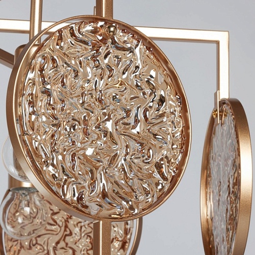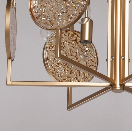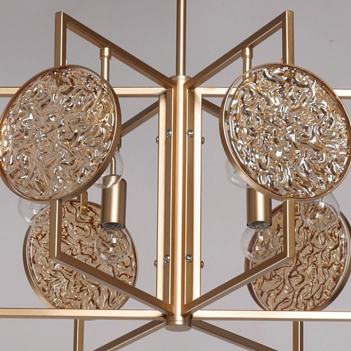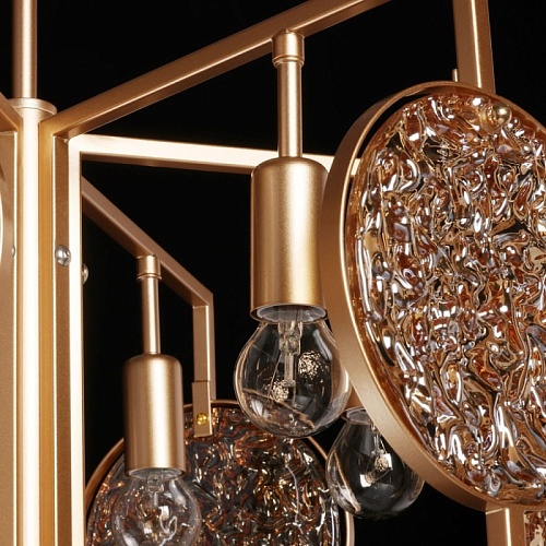 Металлическое основание подвесной люстры окрашено в цвет перламутрового золота. Декор выполнен из фактурного стекла, гальванизированного в цвет янтаря.