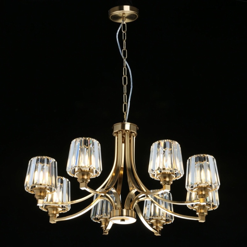 Металлическое основание светильника гальванизировано в цвет бронзы. Плафоны люстры декорированы прозрачным хрусталем прямоугольной формы со сложной огранкой.